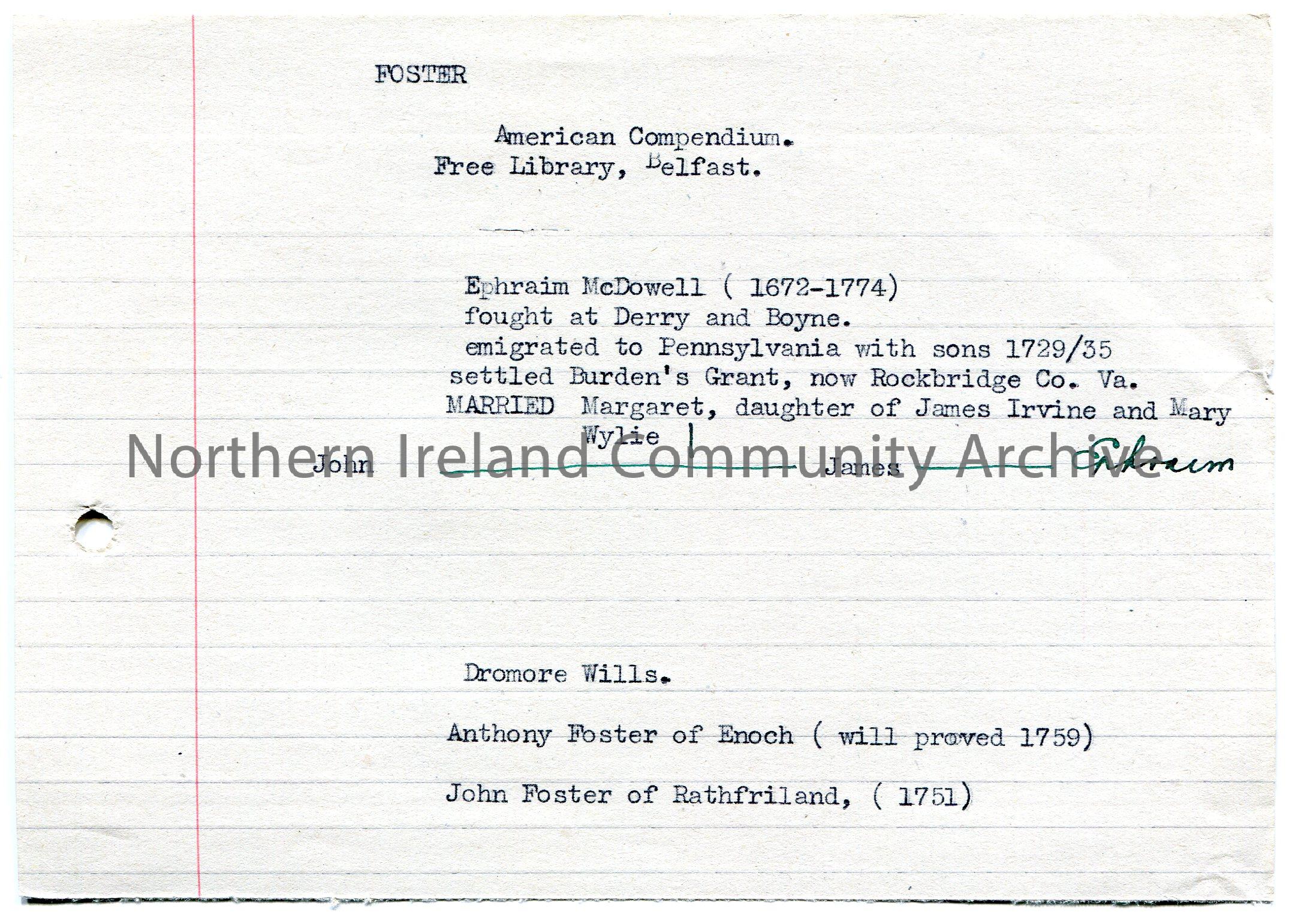 Typed notes on lined paper re surname Foster. From the 'American Compendium. Free Library, Belfast'. Mentions genealogical information re Ephraim McDowell who fought at Derry and the Boyne.