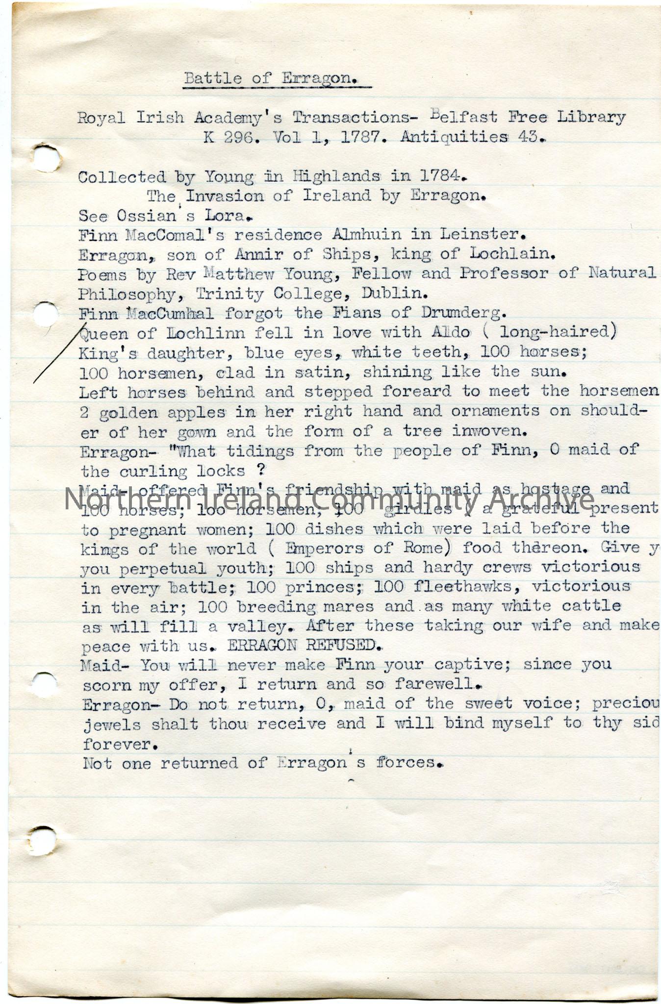 Typed notes on lined paper re the Battle of Erragon and the invasion of Ireland by Erragon. Appears to be extracts from 'Royal Irish Academy's Transactions' in Belfast Free Library, K 296, Vol. 1, 1787, Antiquities 43.
