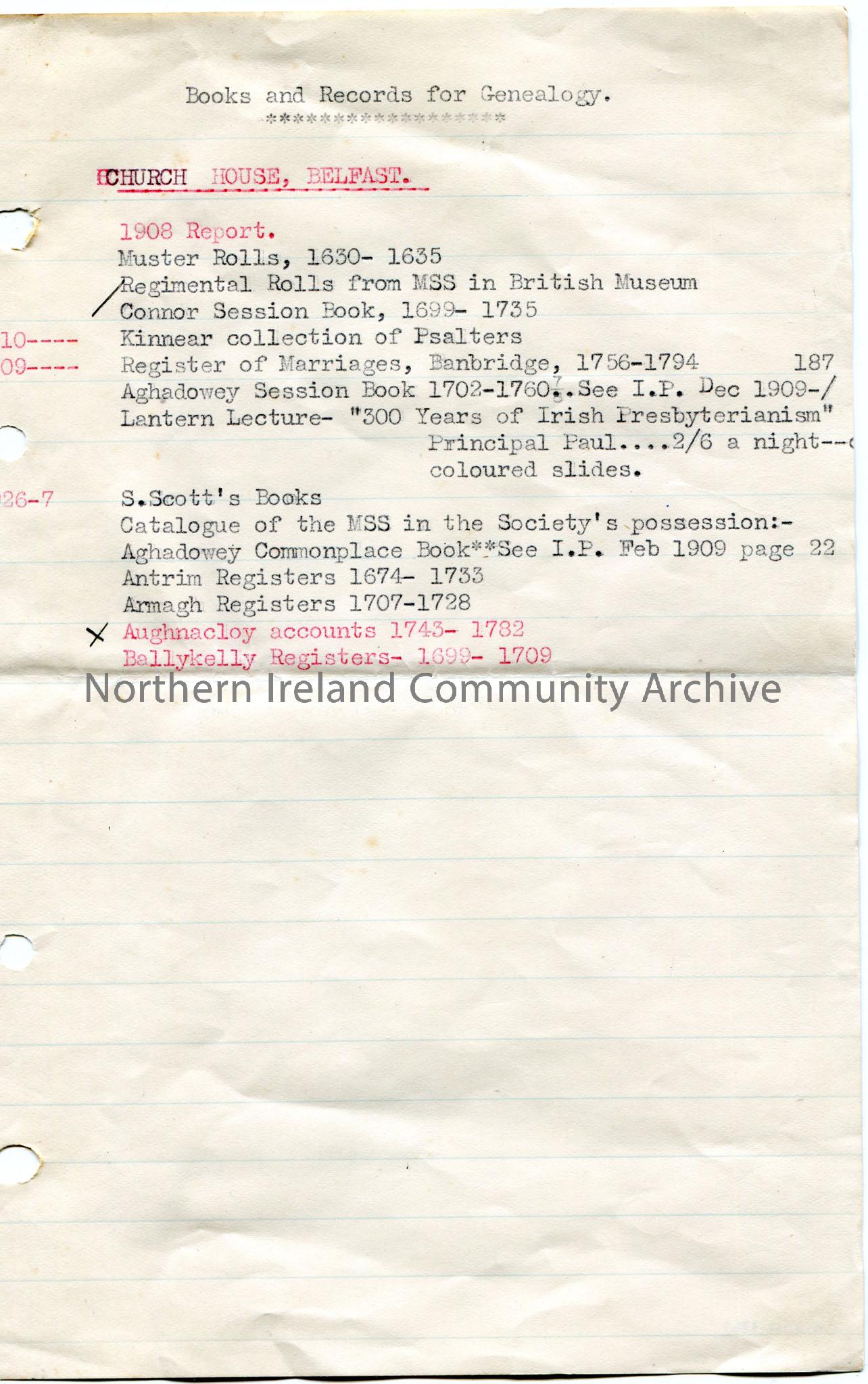Typed notes on lined paper titled, 'Books and Records for Genealogy'. Church House, Belfast. Mentions Muster Rolls, Register of Marriage Banbridge, Aghadowey Session Book, Antrim, Armagh and Ballykelly Registers.