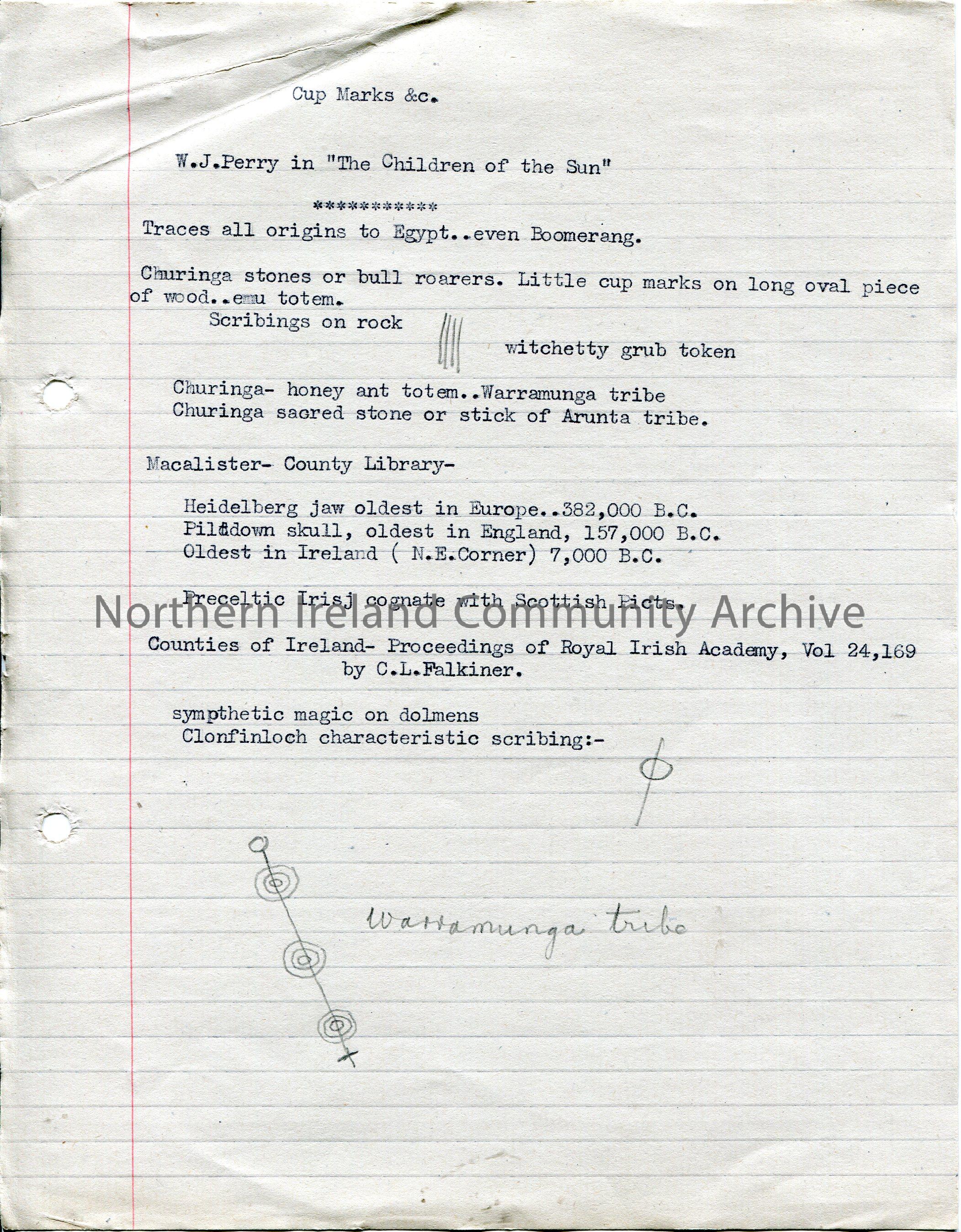 Typed notes on lined paper titled, ‘Cup Marks &c. W.J.Perry in “The Children of the Sun”. Re origins of stone markings. Features pencil drawings of ma…