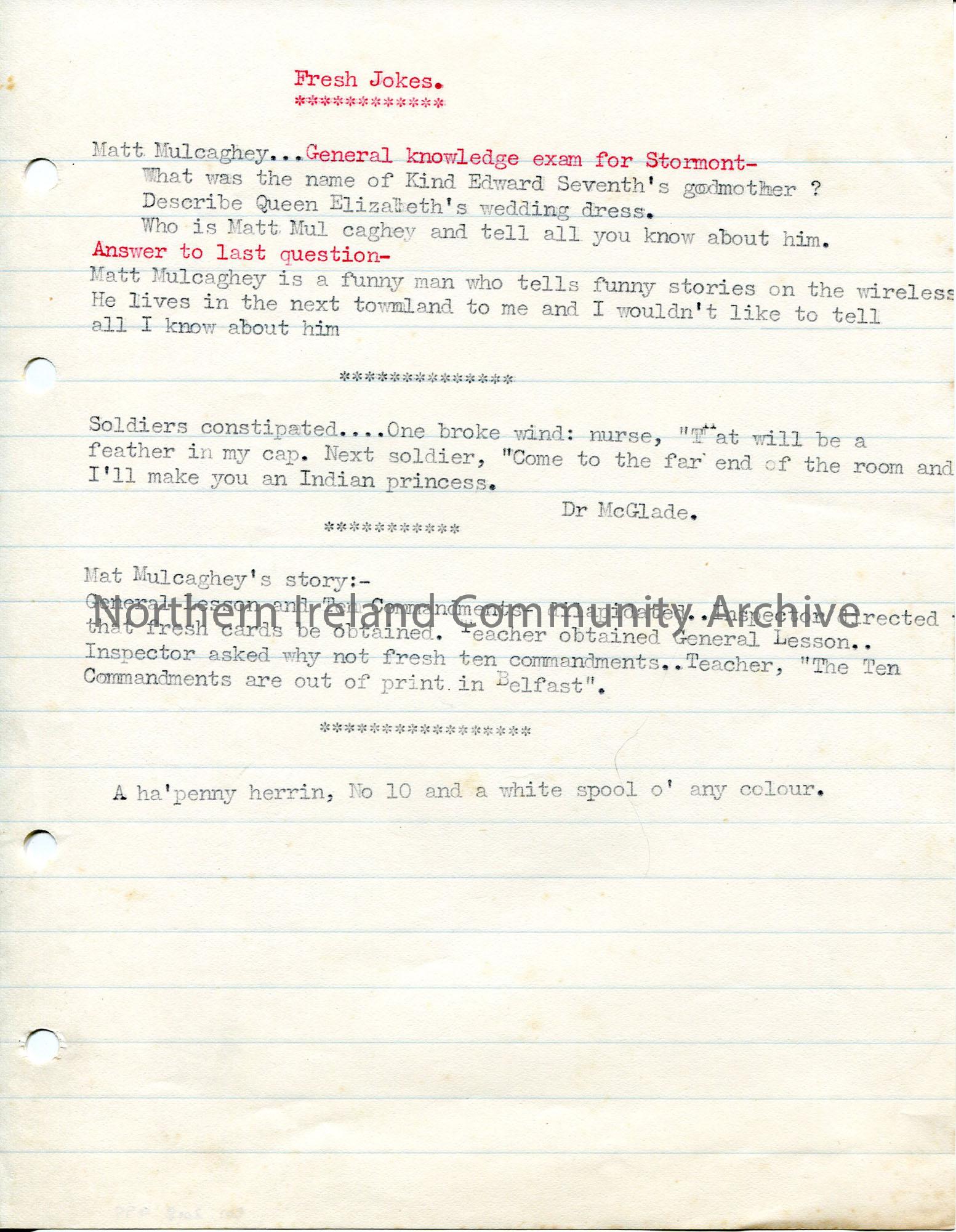 Typed notes on lined paper titled, ‘Fresh Jokes’. Refers to Matt Mulcaghey.