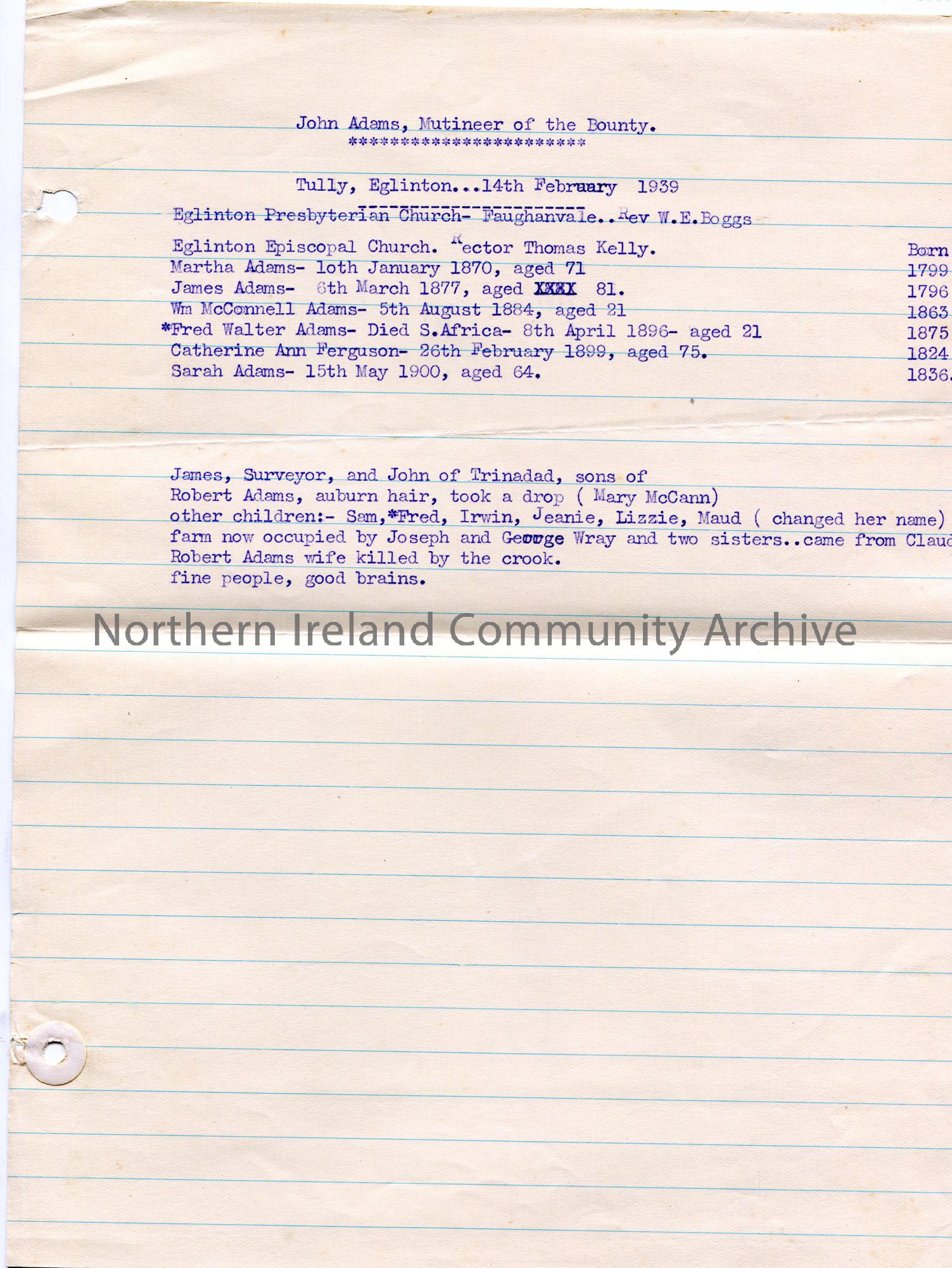 Typed notes on lined paper titled, 'John Adams, Mutineer of the Bounty.' Tully, Eglinton, 14th February, 1939. Genealogical records of Adams family.