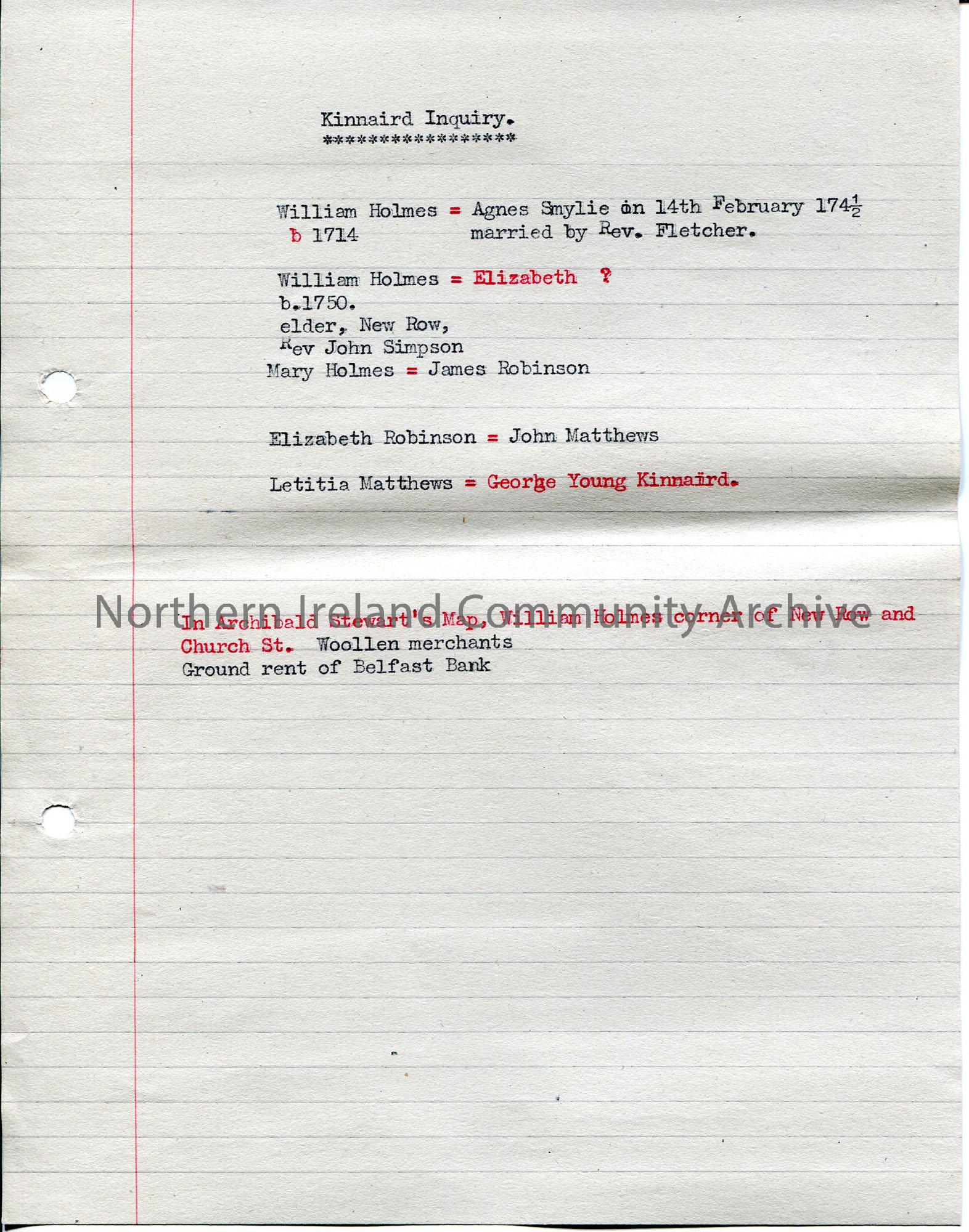 Typed notes on lined paper titled, ‘Kinnaird Inquiry’. Re genealogical information re William Holmes.