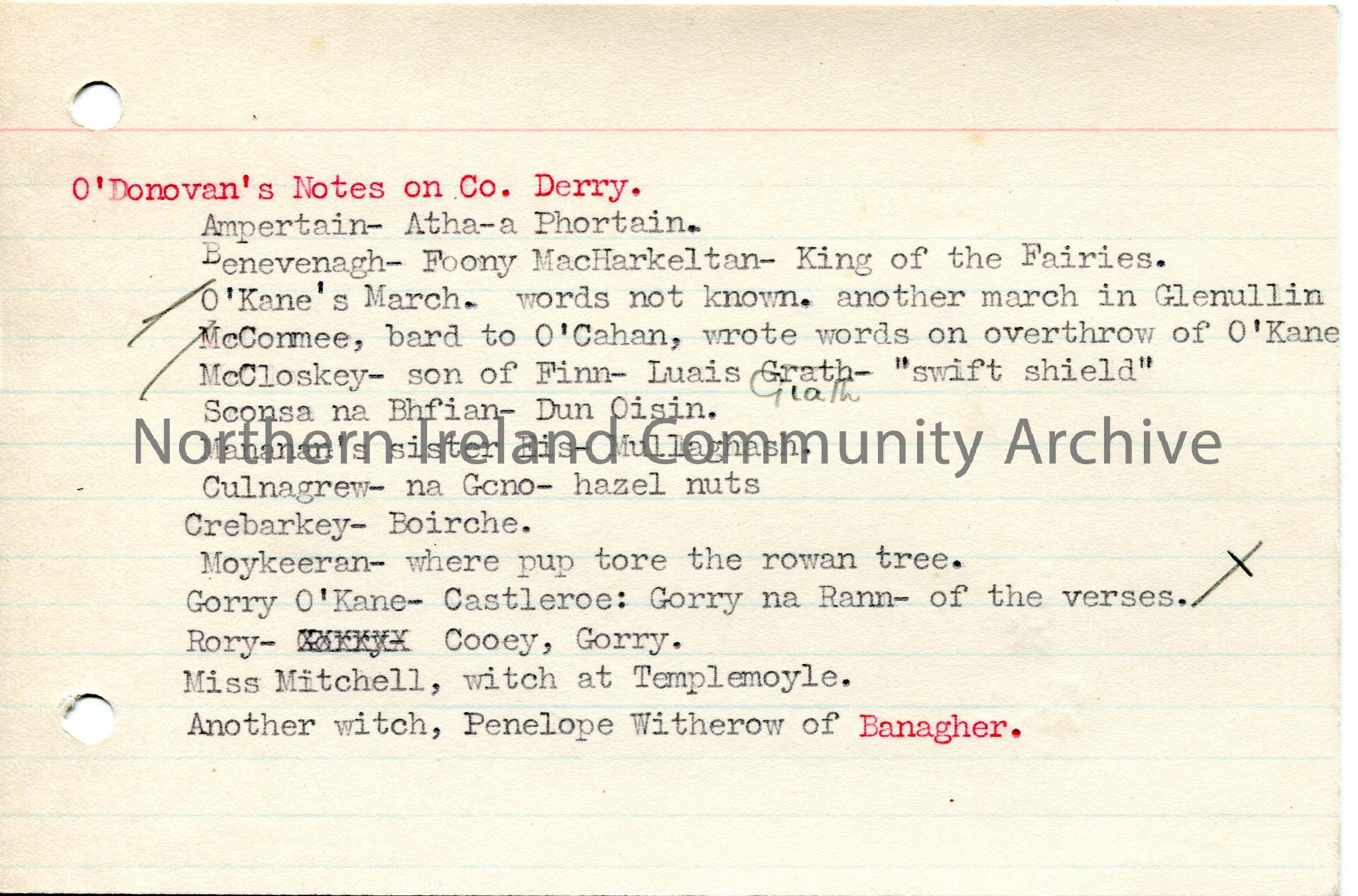 Typed notes on 'on Co. Derry' - single lines on various subjects - songs, people, locales