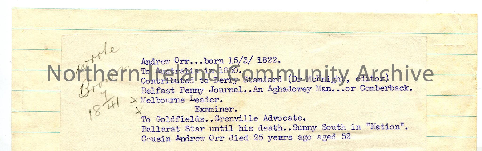Typed notes on paper affixed to lined page re Andrew Orr – newspapers he contributed to.