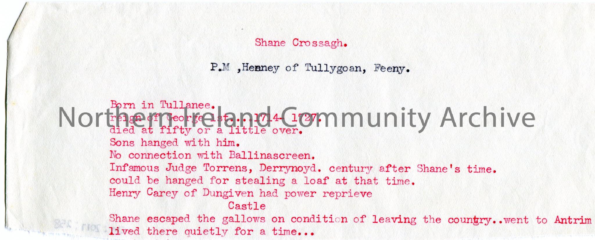 Typed notes on paper cut from a larger page. Notes titled, 'Shane Crossagh, P.M. Heeney of Tullygoan, Feeny'. Re stages and events in Shane Crossagh's life.