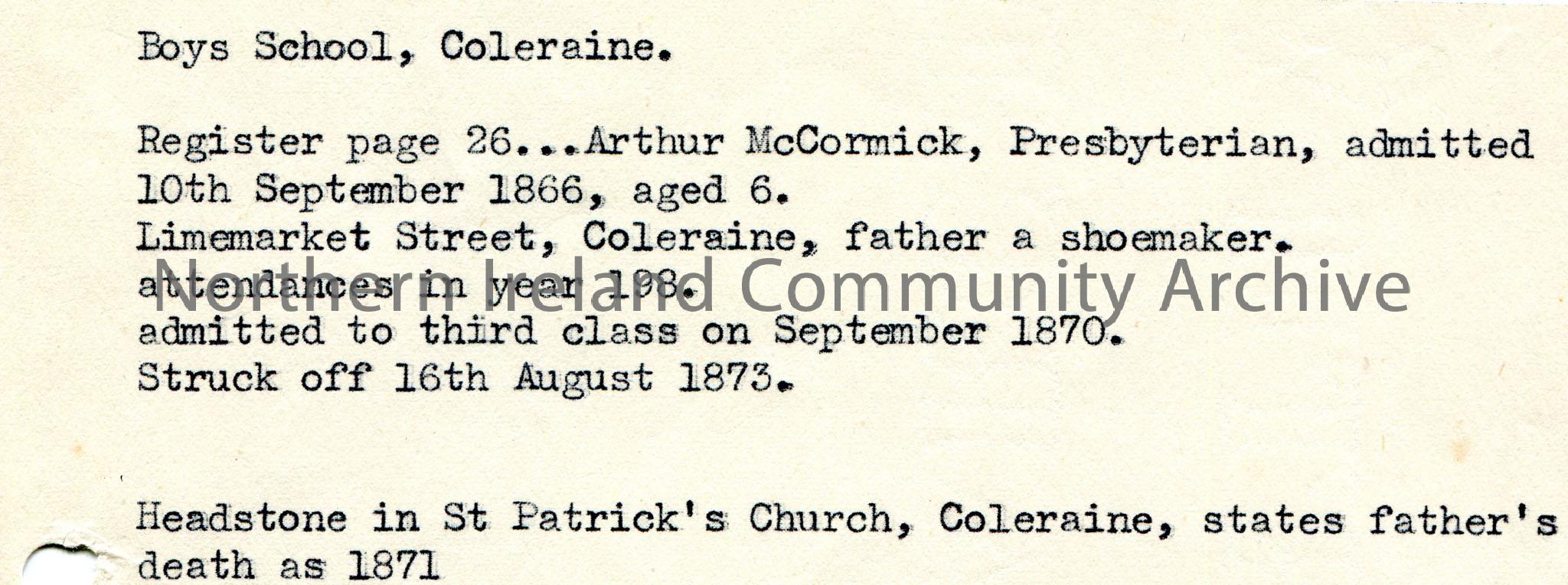 Typed notes on paper re Boys School, Coleraine. Mentions Arthur McCormick, Limemarket Street, Coleraine. Headstone at St Patrick’s Church, Coleraine.