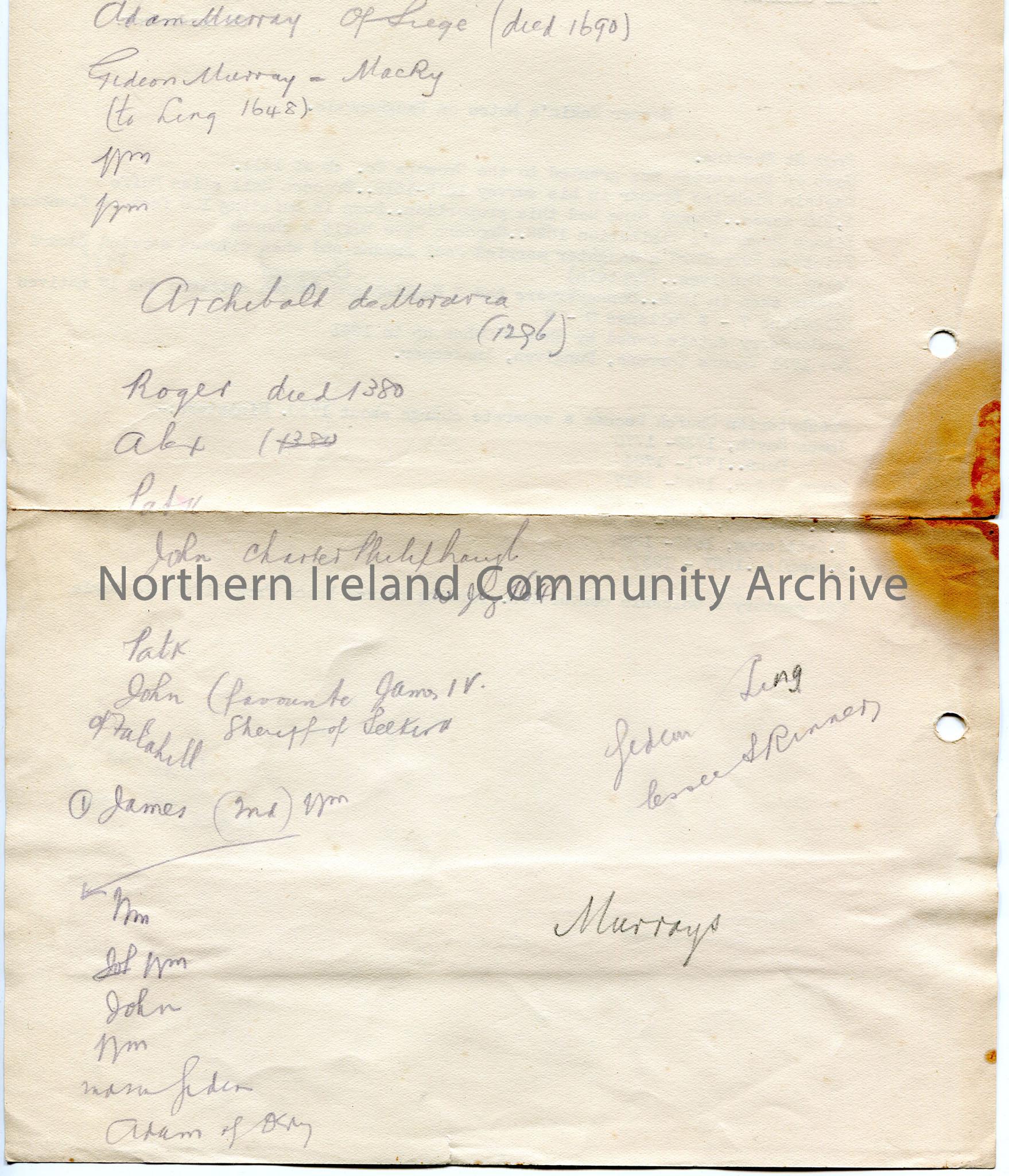 Typed notes on personal headed paper belonging to Sam Henry. Notes titled, 'Horner Eakin's Notes on Faughanvale'. Re parish and list of Ministers of the Presbyterian Church from 1732 to 1937. 'James Henderson M. D. Drumaho, Cross, Co. Derry' handwritten in black ink on a strip of paper and stuck to the larger page. Notes are annotated in pencil. Handwritten notes in pencil on back of page re Murray.
