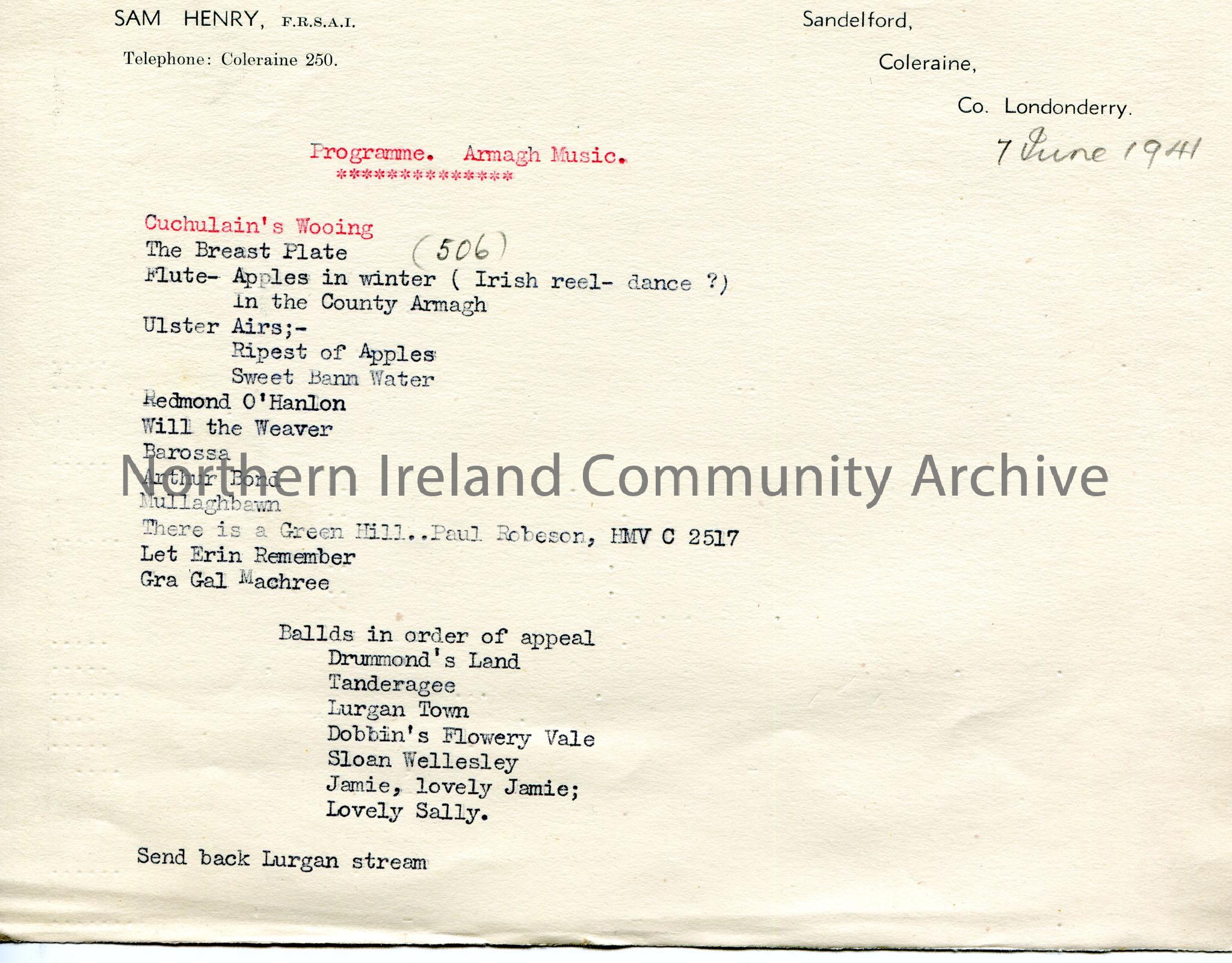 Typed notes on personal headed paper of Sam Henry. Titled, ‘Programme. Armagh Music’. List of the songs for the script. Dated 7th June, 1941.