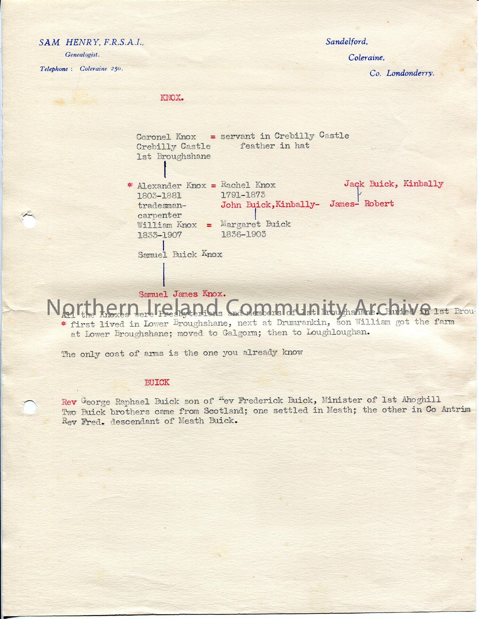 Typed notes on Sam Henry’s headed letter paper. Knox family tree. Mentions Broughshane. Note on surname Buick. Mentions Ahoghill.