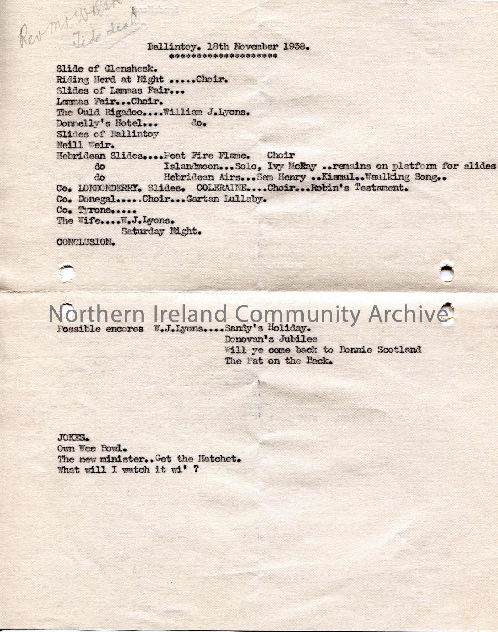 Typed notes on the back of Sam Henry personal headed paper re lecture in Ballintoy on 18th November, 1938. Contains list of slides used; possible encores and jokes. 'Rev Mr Walsh Tide dial' handwritten in pencil top left of page.