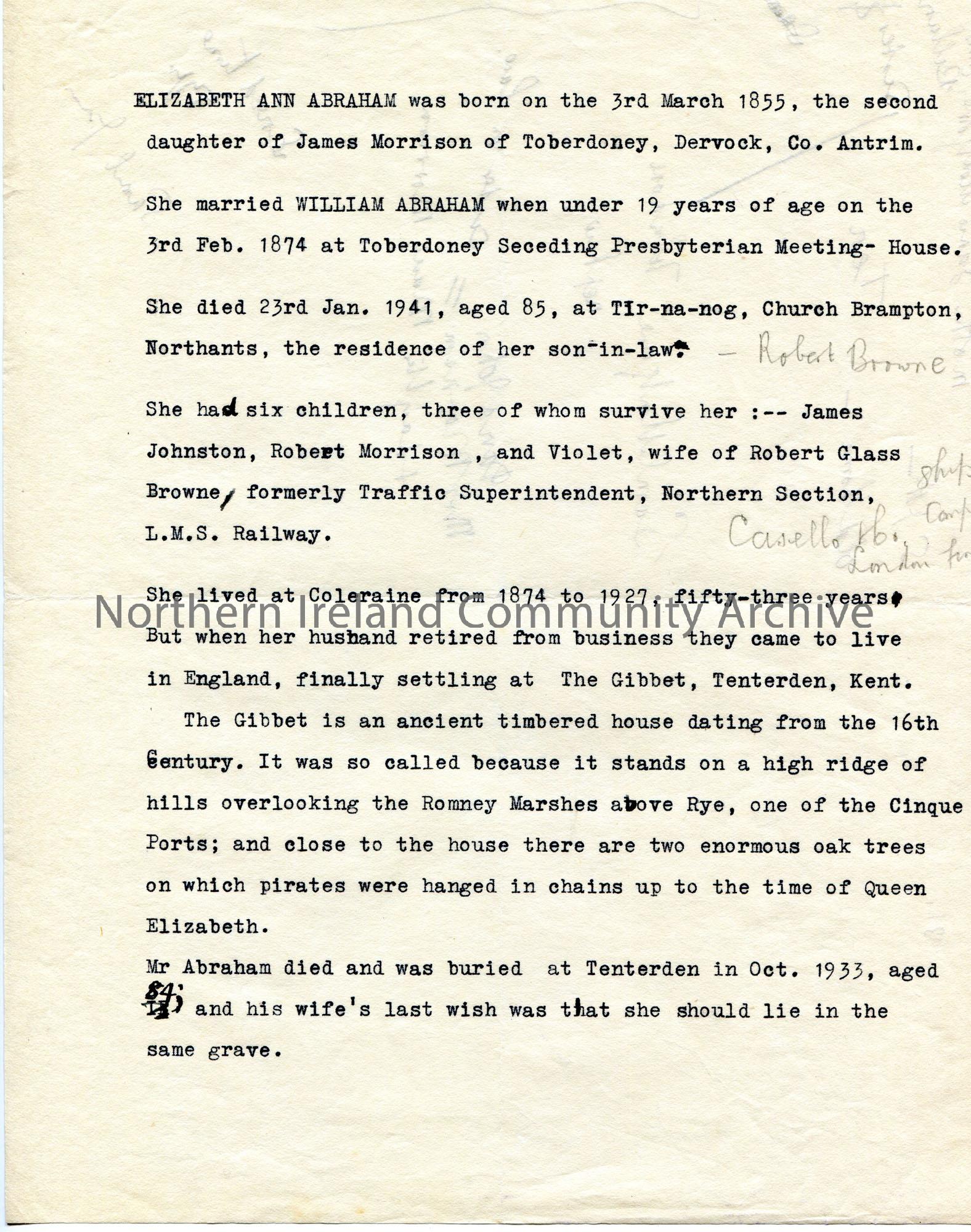 Typed notes on the life of Elizabeth Ann Abraham up until her death in 1941. She was the mother of James Johnston Abraham. Handwritten rough notes in pencil on back of page re Montgomery and Morrison family names.