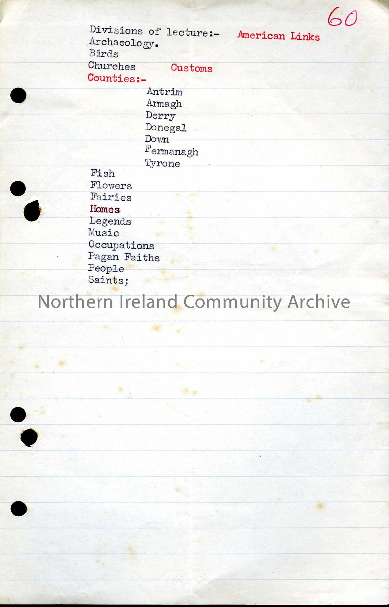 Typed notes outlining the divisions of a lecture.