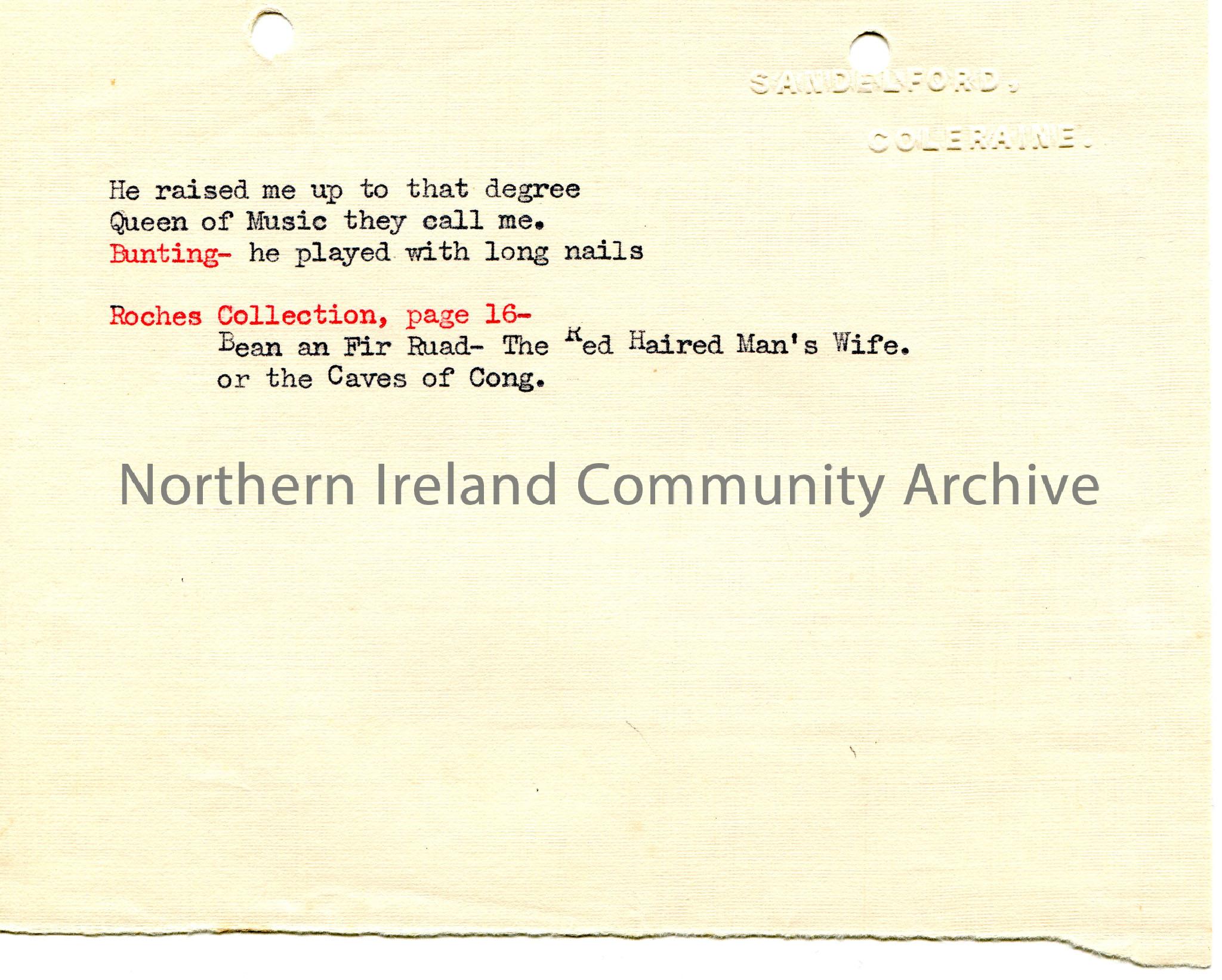 Typed notes. Page appears to be torn from a larger page with 'Sandelford, Coleraine' embossed on top right corner. Inscription - 'He raised me up to that degree, Queen of Music they call me'. Mentions Bunting and the song - 'The Red Haired Man's Wife' and 'The Caves of Cong' from Roches' Collection.