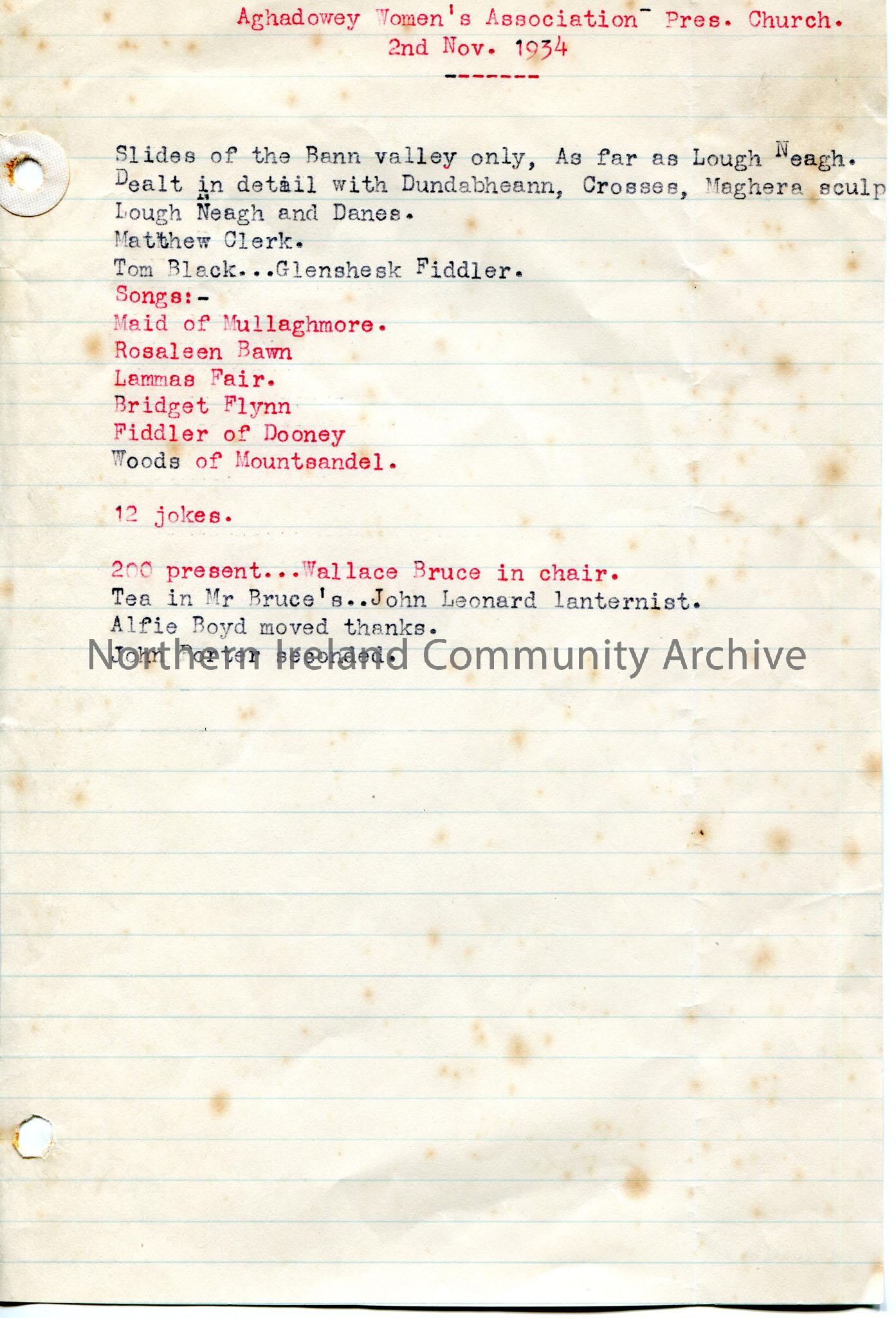 Typed notes re a lecture at Aghadowey Women's Association Presbyterian Church on 2nd November, 1934. Notes re the slides used of the Bann Valley; songs sang; 12 jokes; 200 were present. Those present were Wallace Bruce, John Leonard as lanternist, Alfie Boyd and John Porter.