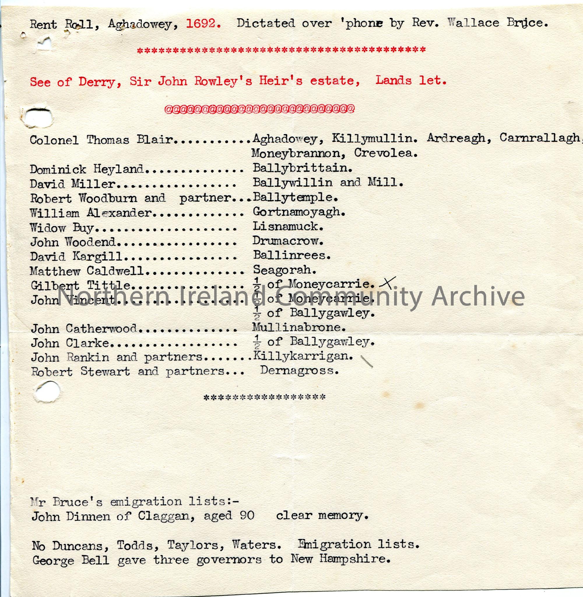 Typed notes re Aghadowey Rent Roll 1692 – ‘See of Derry, Sir John Rowley’s Heir’s Estate, Lands Let’ – list of names against area let