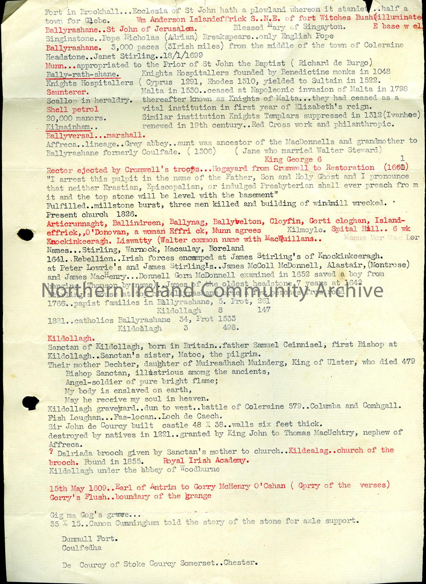 Typed notes re: Ballyrashane