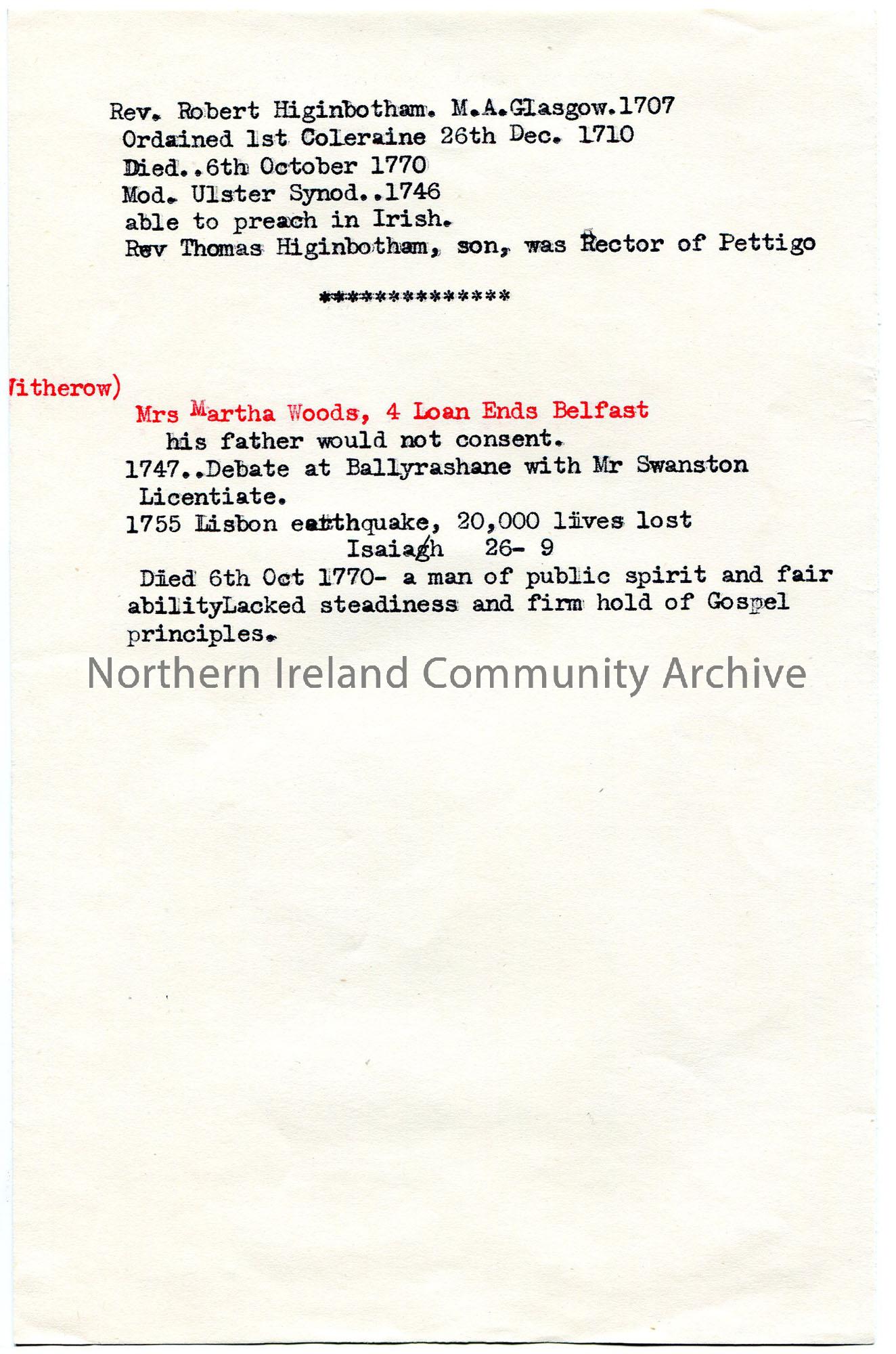 Typed notes re Blair inquiry and genealogical information re Knox family. Mentions Samuel Wright Knox, Rev William Knox and Dr R. Kyle Knox. Also mentions Clonmel, Dunboe, Ballyvennox. Rough notes, not in context, handwritten in pencil on back of page.