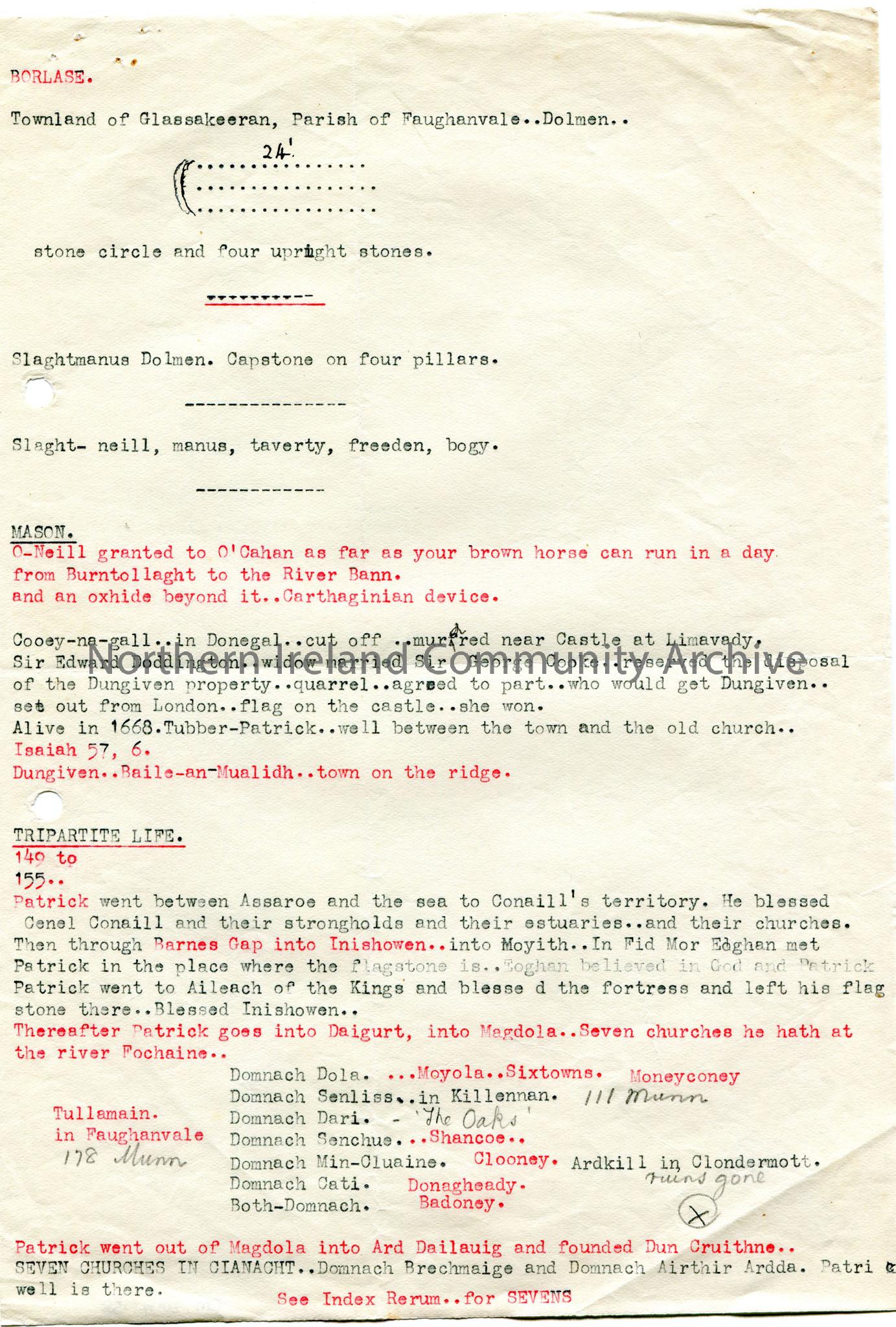 Typed notes re Borlase, townland of Glassakeeran. Mentions the names O'Neill, O'Cahan, Sir Edward Doddington, Sir George Cooke. Refers to Dungiven. Other notes re St.Patrick and the seven Churches in Cianacht.