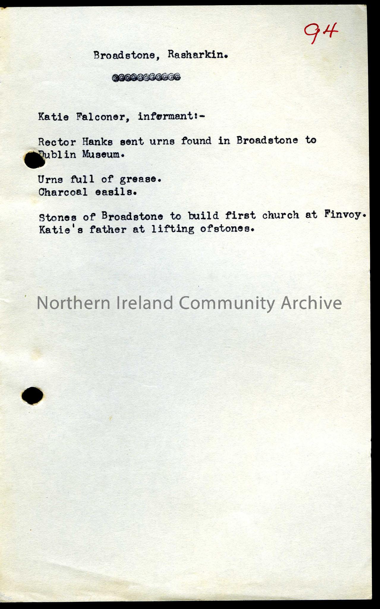 Typed notes re: Broadstone, Rasharkin. Katie Falconer is named as the informant. Rector Hanks sent urns found in Broadstone to Dublin Museum. Stones of Broadstone to build first church at Finvoy. Katie's father at lifting of stones.