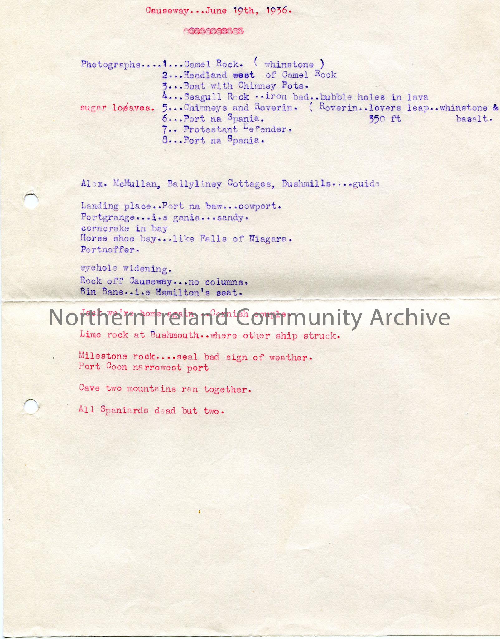 Typed notes re Causeway. Dated June 19th, 1936. List of photographs numbered 1-8.