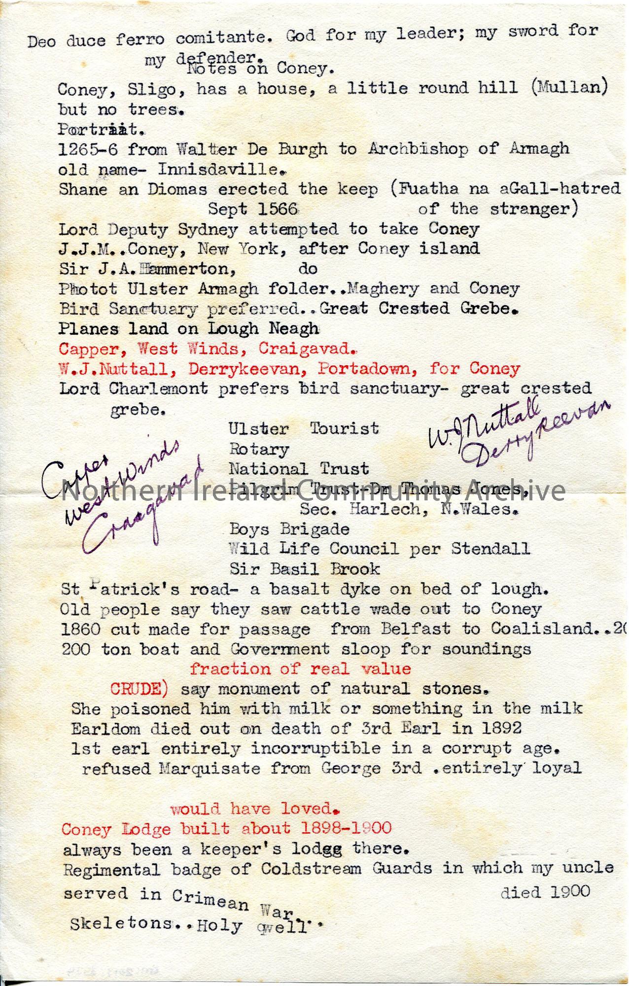 Typed notes re Coney Island, Lough Neagh. Part of Sam Henry’s attempts to have the island purchased and presented to Americans for their role in North…