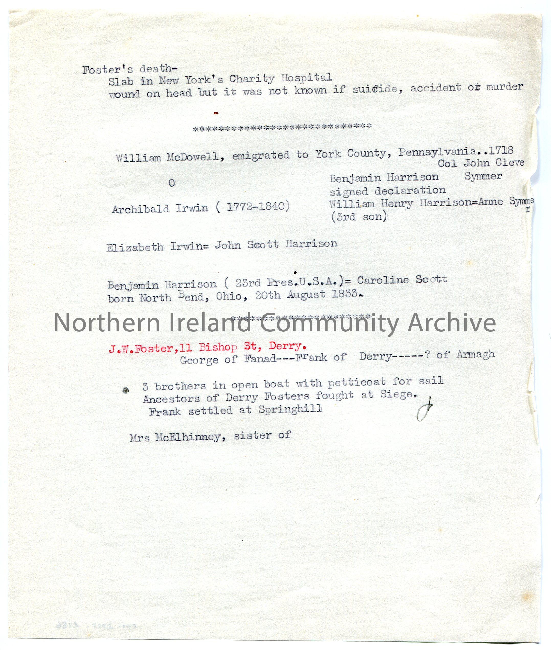 Typed notes re death of Stephen Foster and other genealogical notes which mentions surnames McDowell, Irwin, Harrison and Scott. Notes from J. W. Foster of 11 Bishop Street, Derry re Fosters.