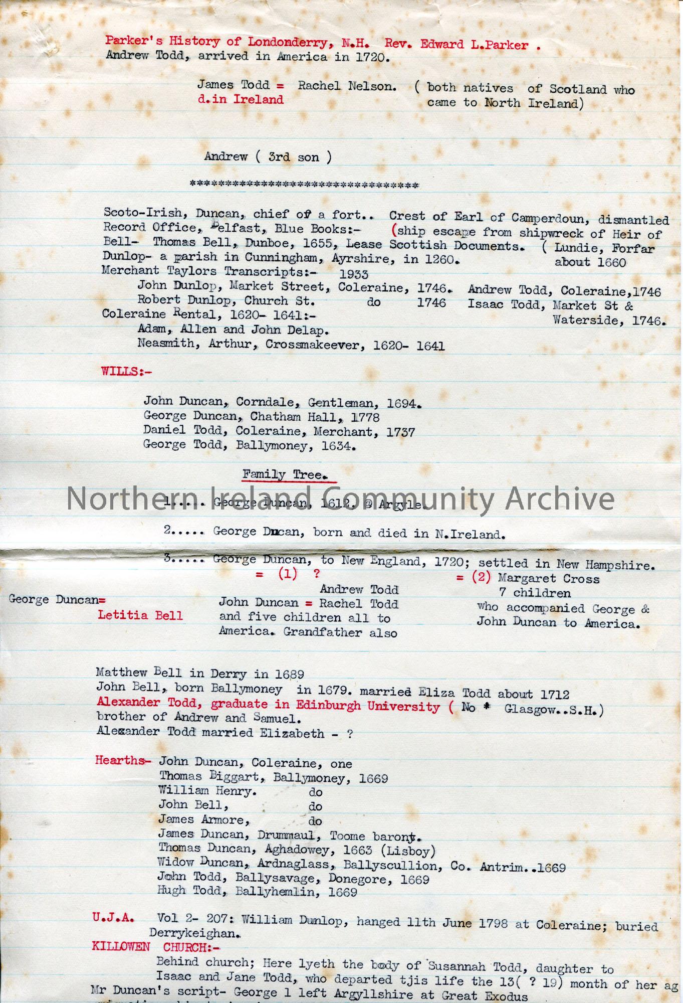 Typed notes re genealogy. Details of Sam’s research into the Duncan and Todd family names. Dates refer to 17th and 18th century.