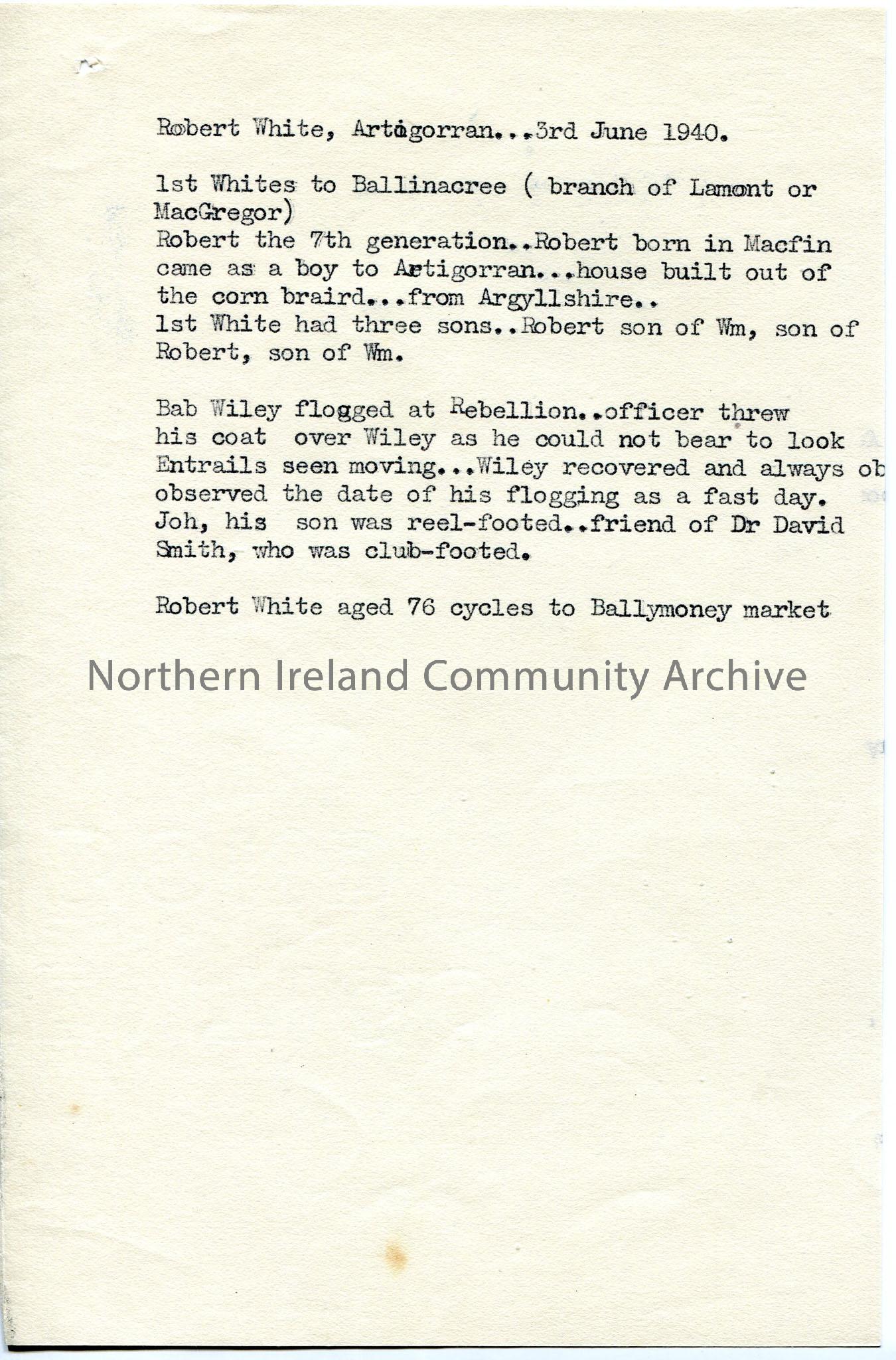 Typed notes re genealogy of White family of Artigoran, originally from Argyllshire, and other notes