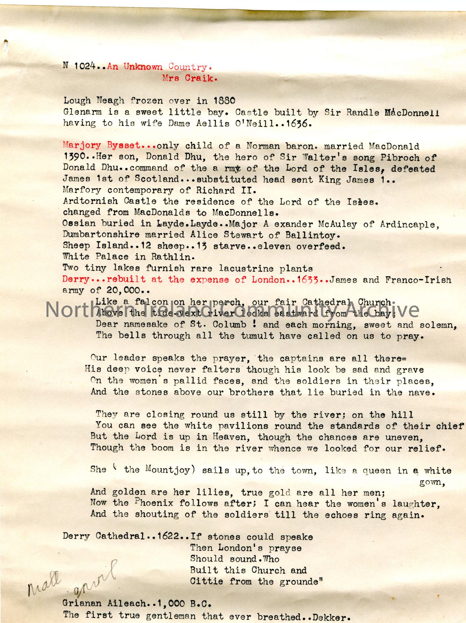 Typed notes re Glenarm, Marjory Bysset and Derry Cathedral Church.
