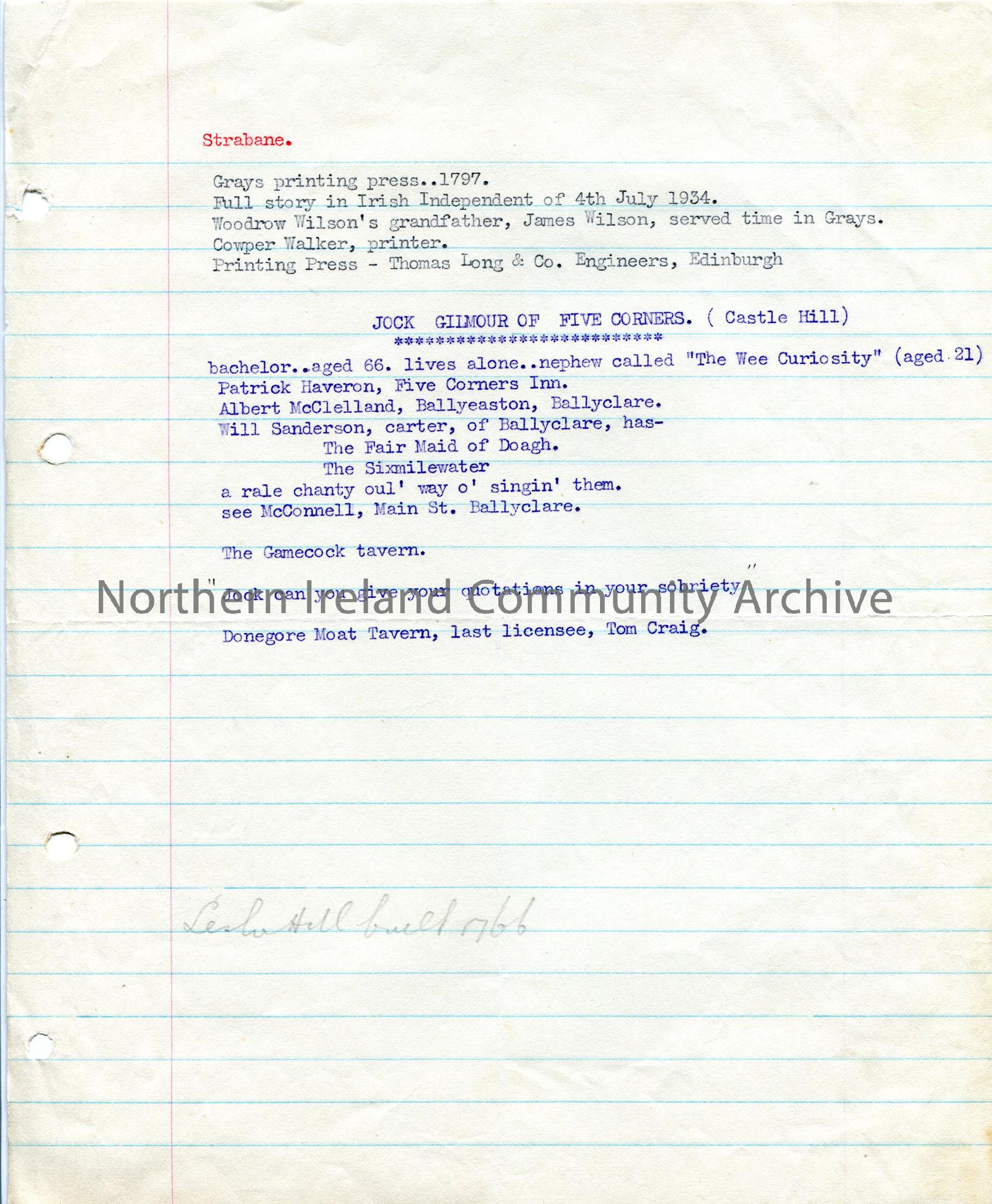 Typed notes re Gray’s Printing Press in Strabane and brief notes re names, some details and their usefulness for songs
