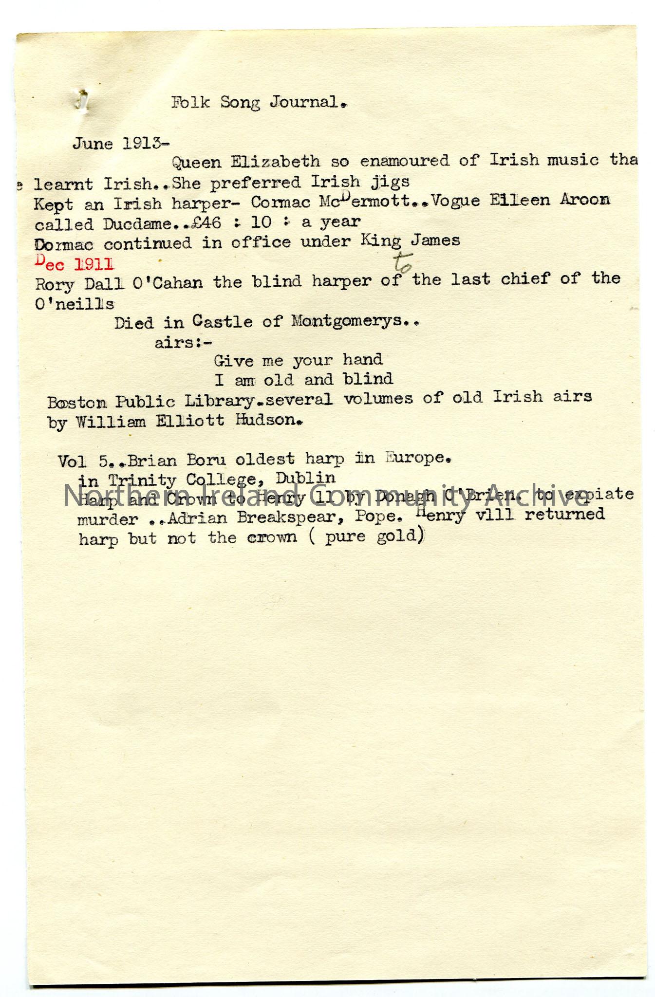 Typed notes re harpers and harp music, including reference to Rory Dall O’Cahan
