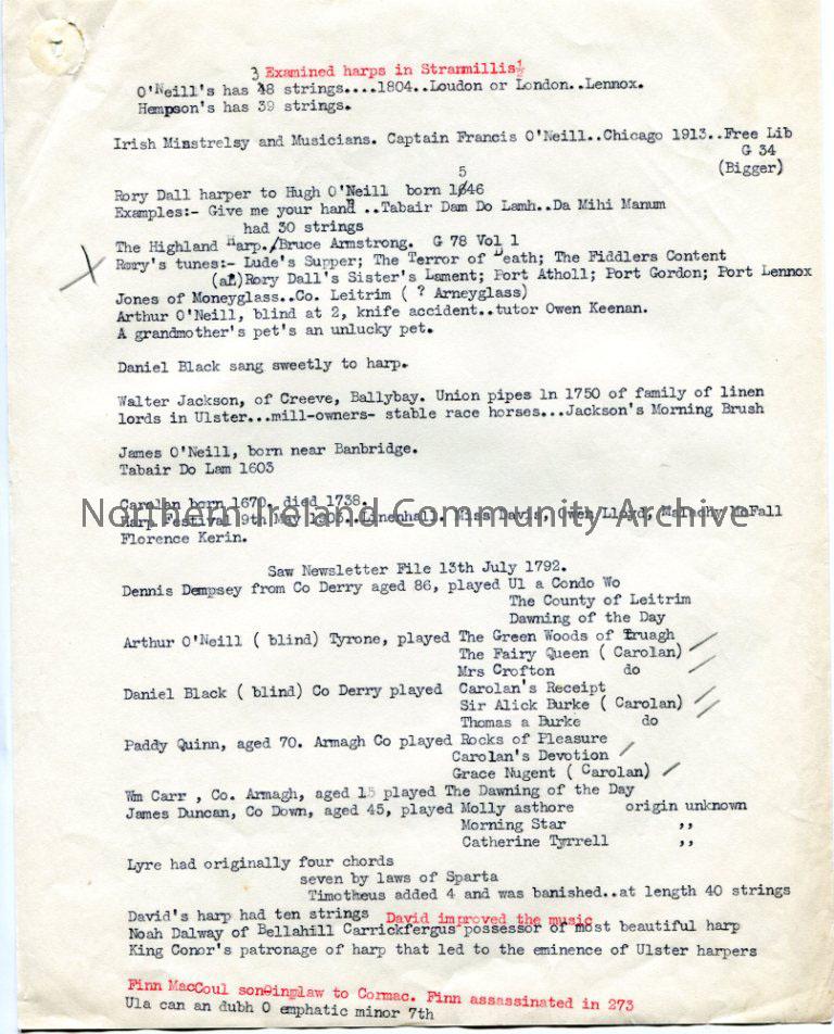 Typed notes re harpers and harps, including Carolan, Hempson, O’Neill, Rory Dall