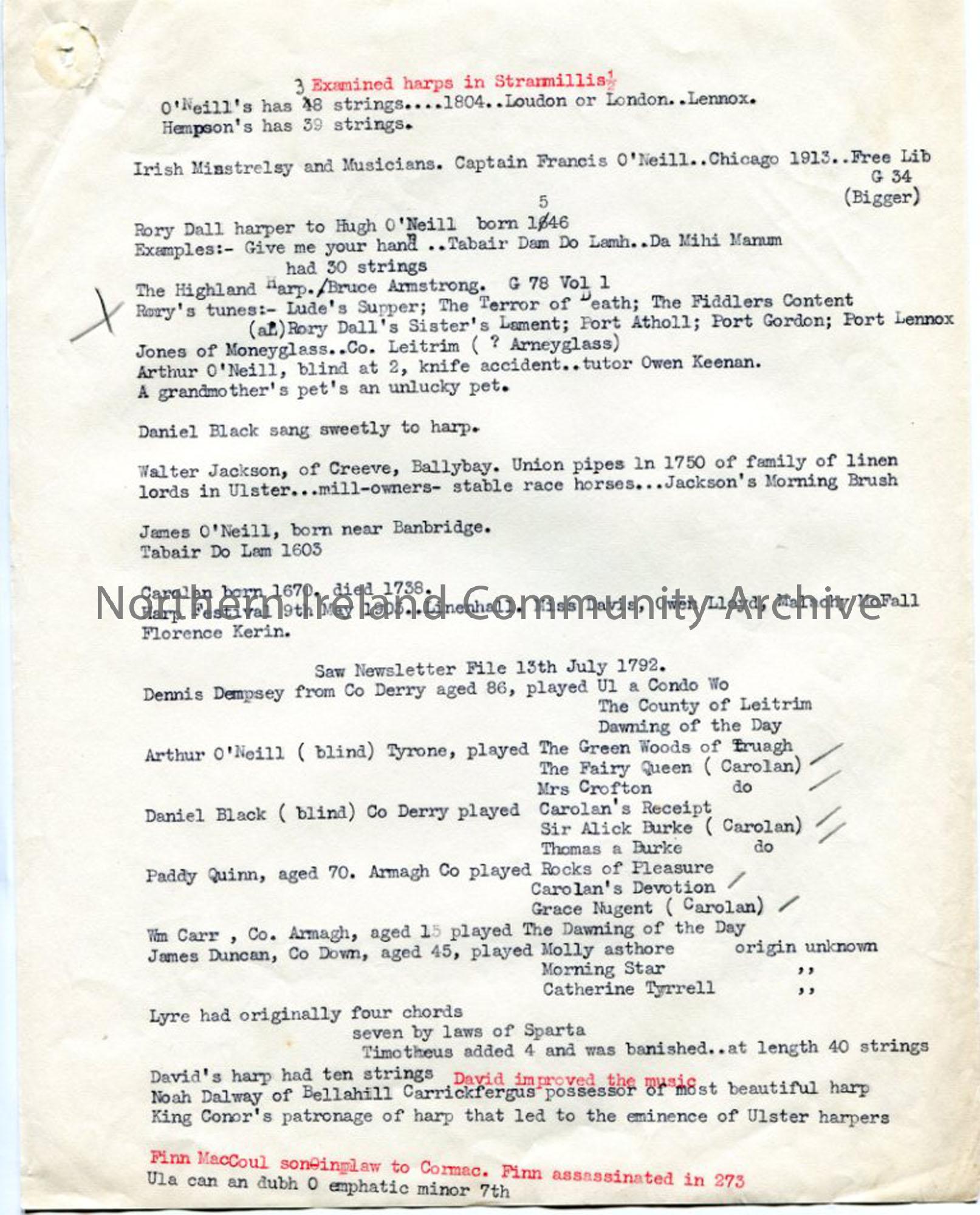 Typed notes re: harpers and harps, including Carolan, Hempson, O'Neill, Rory Dall.
