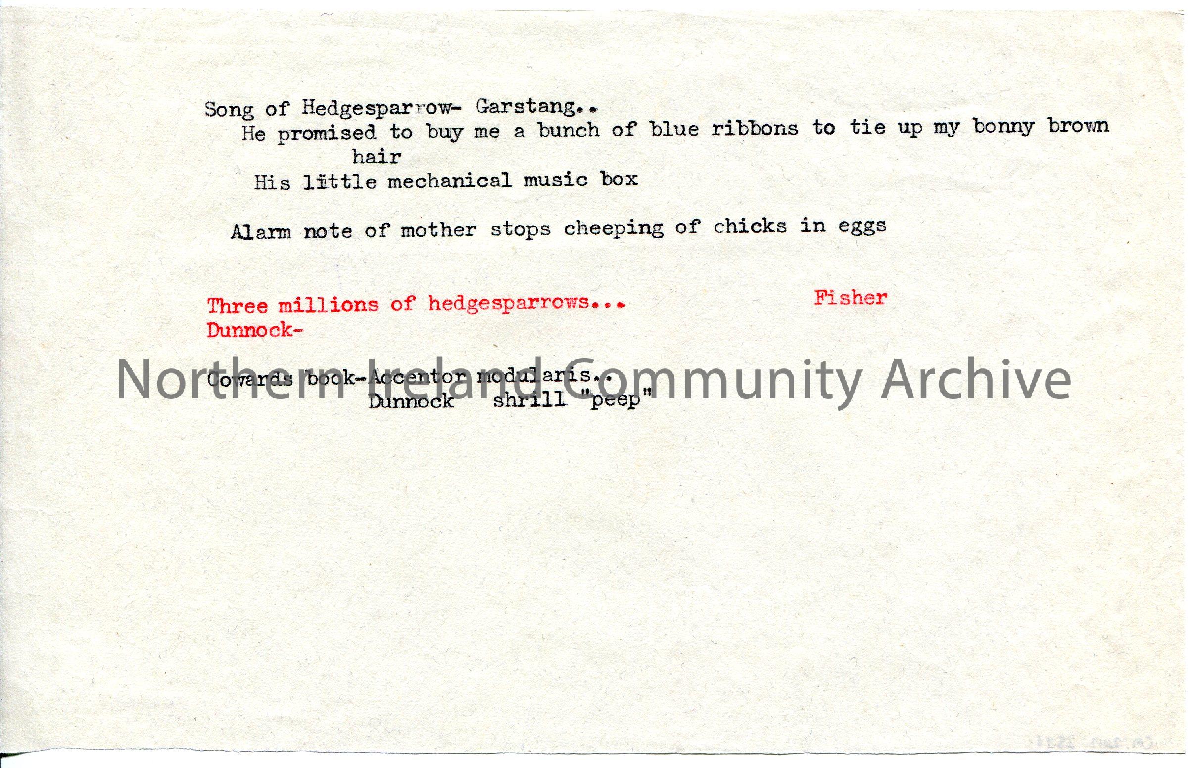 Typed notes re hedgesparrow birds.