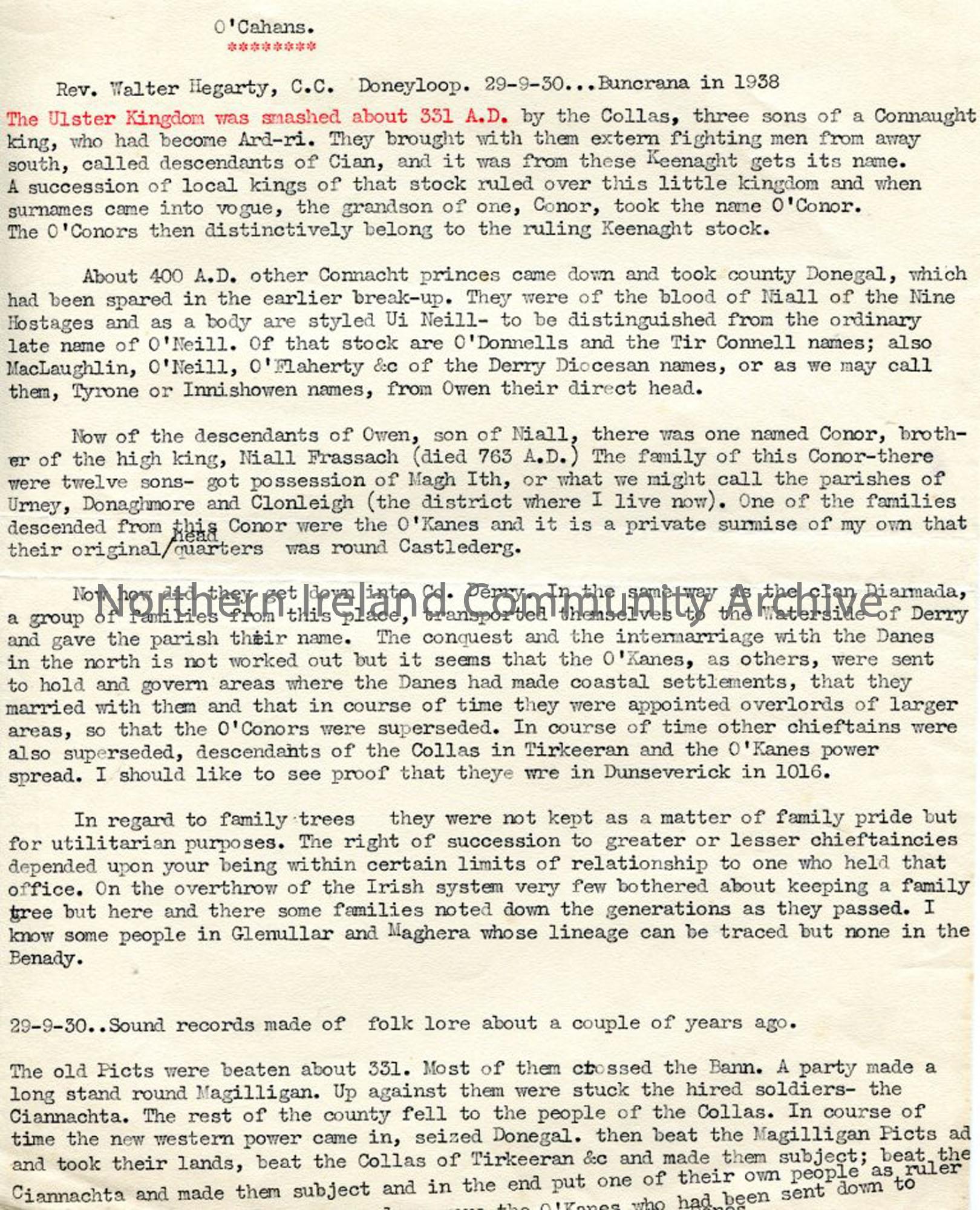 Typed notes re: hisory of O'Cahans in first millennium - Rev Walter Hegarty, Doneyloop, 29.9.1930, provided information.