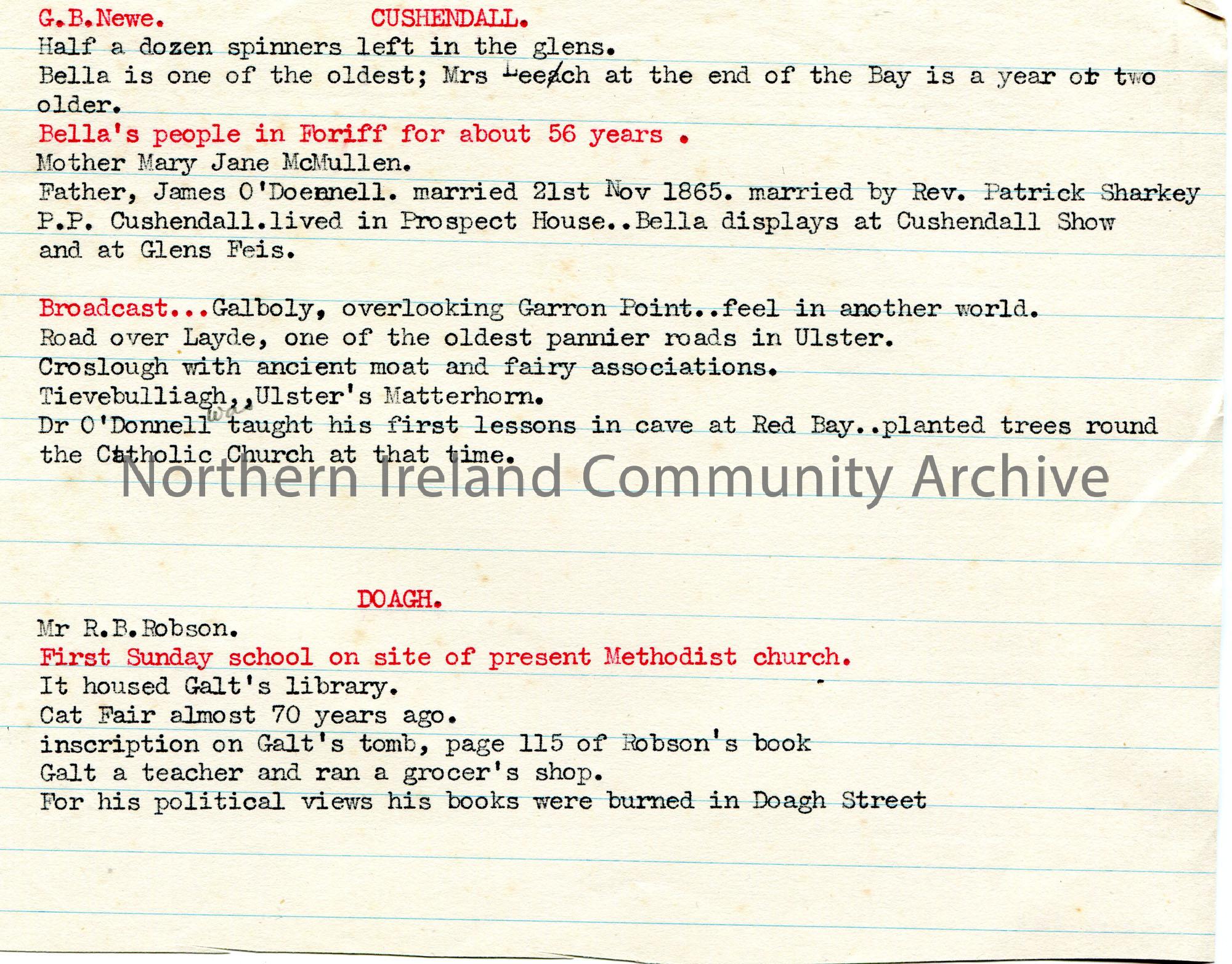 Typed notes re history in Cushendall and Doagh.