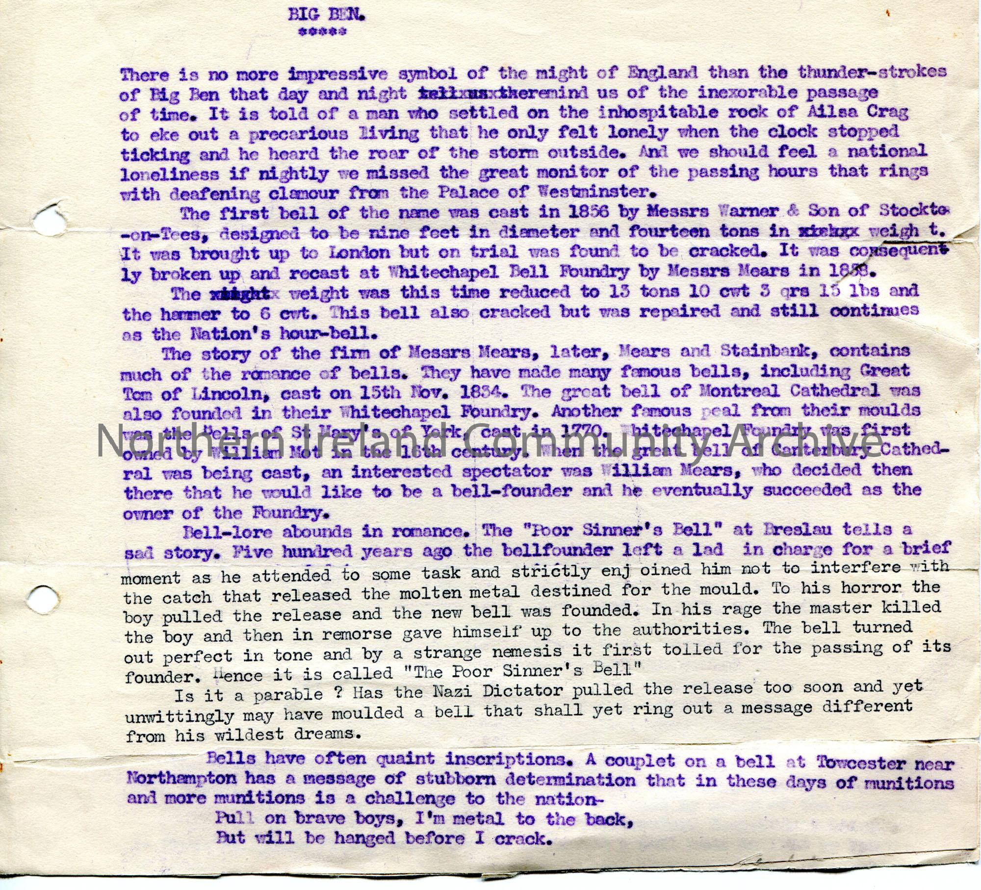 Typed notes re history of Big Ben.