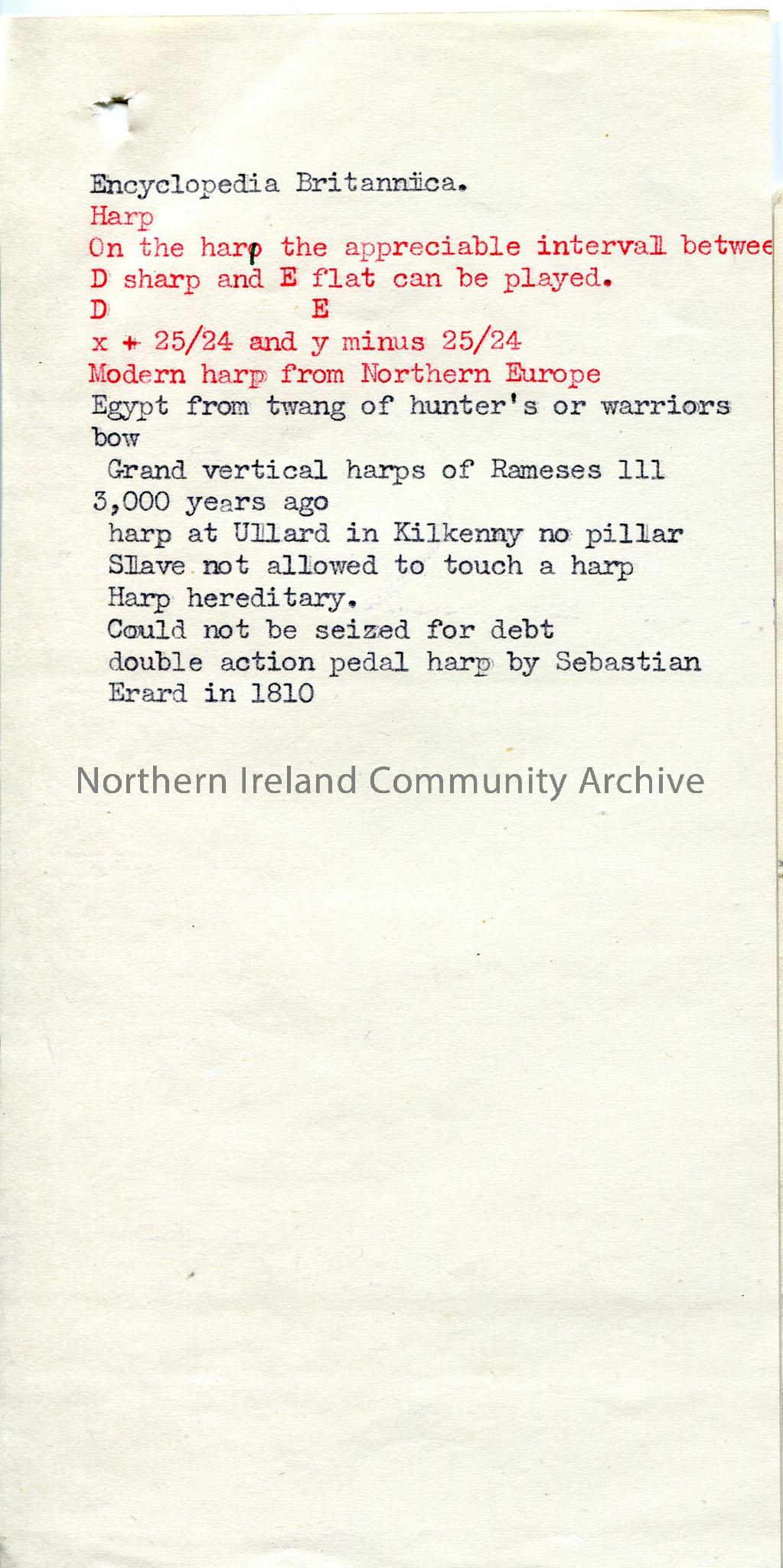 Typed notes re history of harp