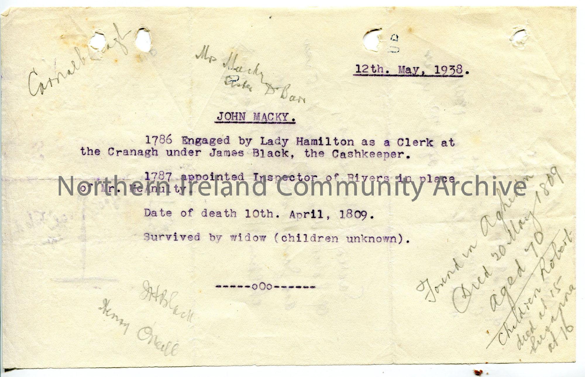 Typed notes re John Macky, river inspector at Cranagh. and added notes in pencil re family. On reverse headstone inscription of Macky (spelled Mackey)…