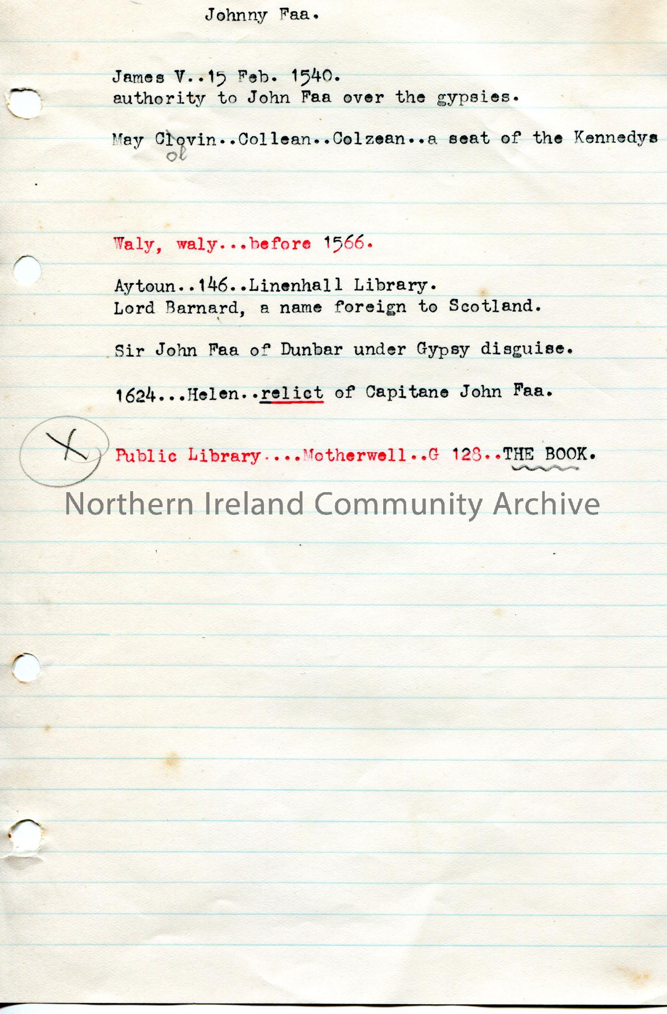 Typed notes re Johnny Faa and gypsies in 16th and 17th centuries.