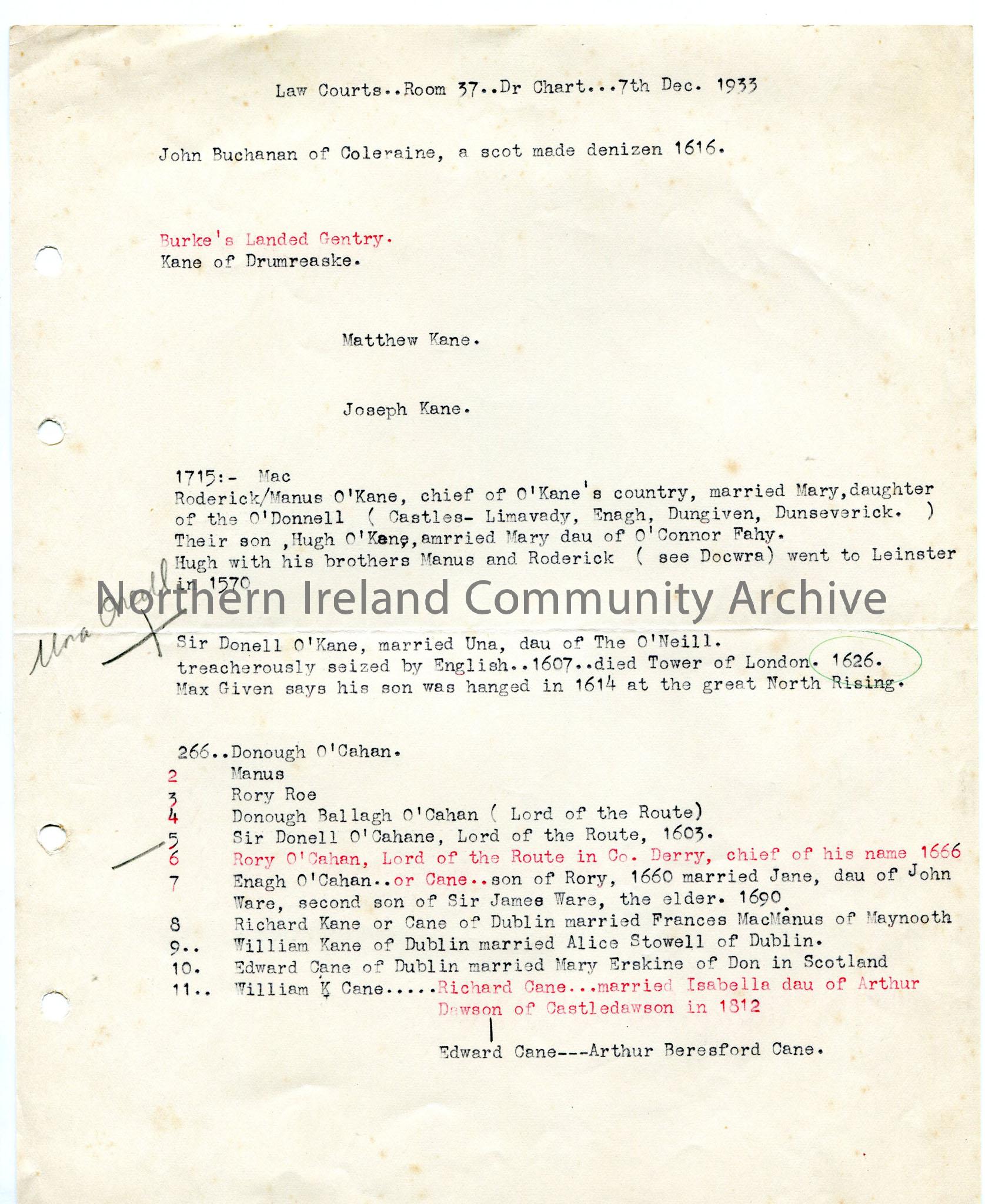 Typed notes re Kanes, O’Kanes, O’Cahans