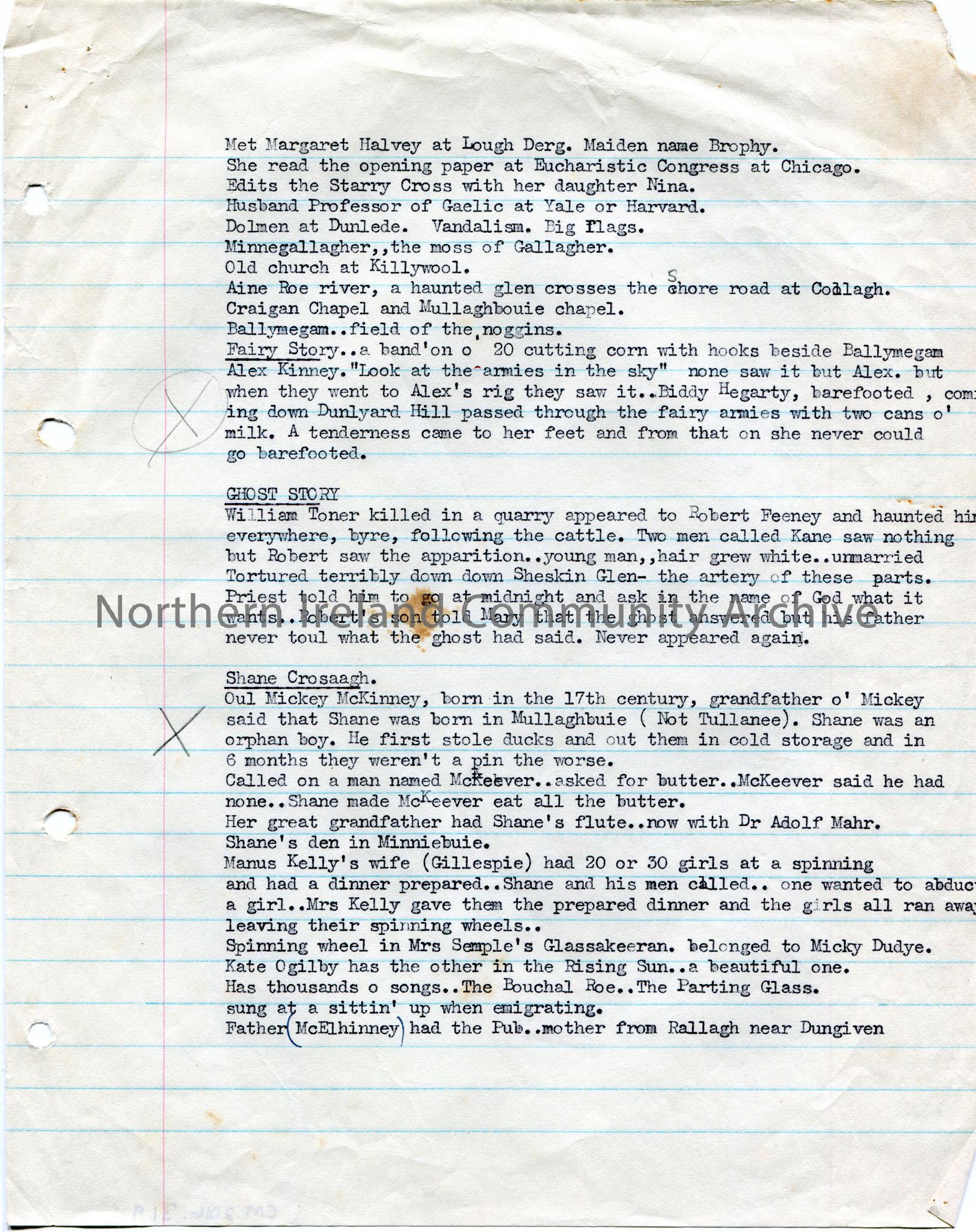 Typed notes re Margaret Halvey, Lough Derg. Other notes on a ‘Fairy Story’, ‘Ghost Story’ and ‘Shane Crosaagh’.