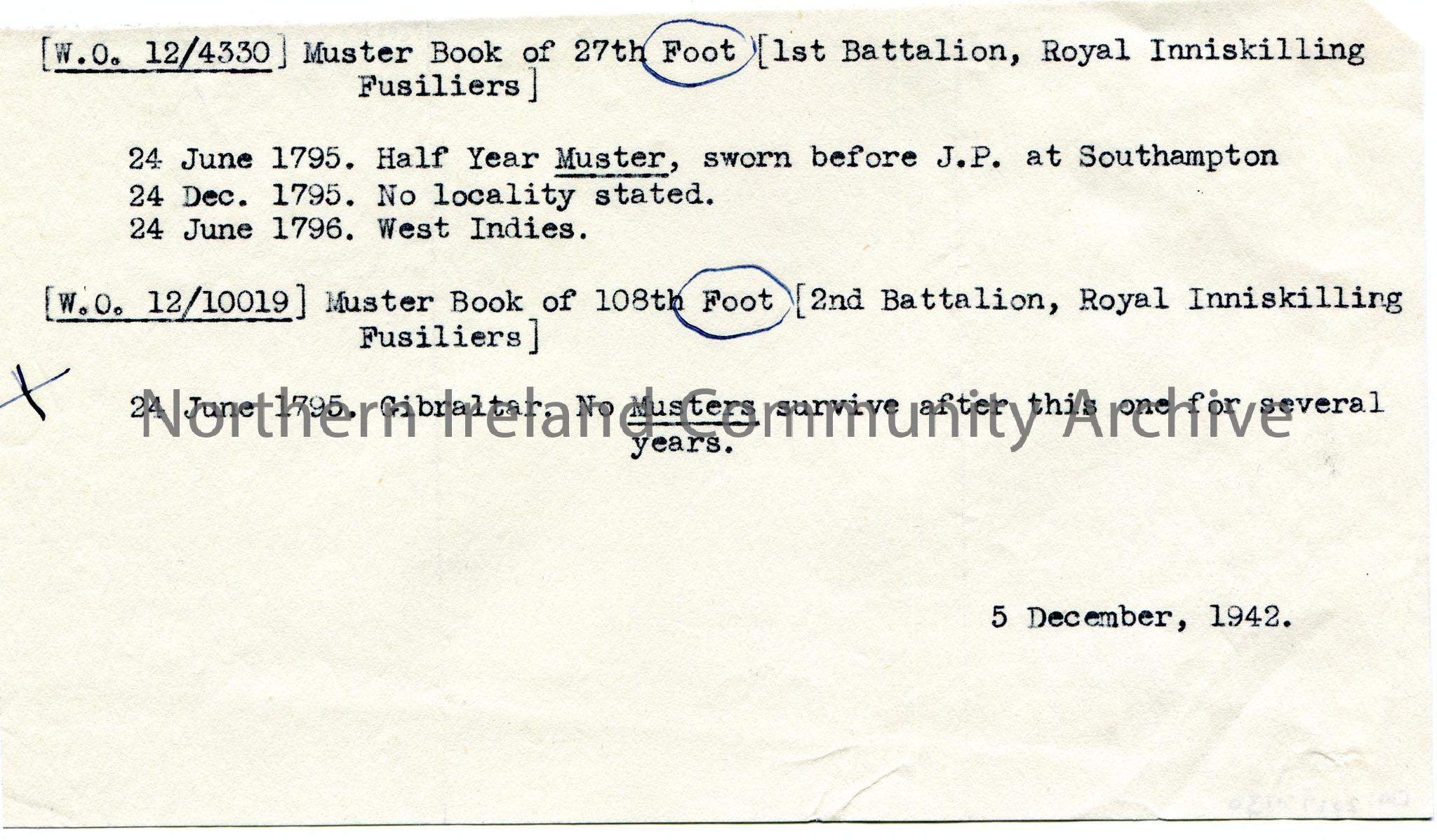 Typed notes re Munster Books of 1st and 2nd Royal Inniskilling Fusiliers.