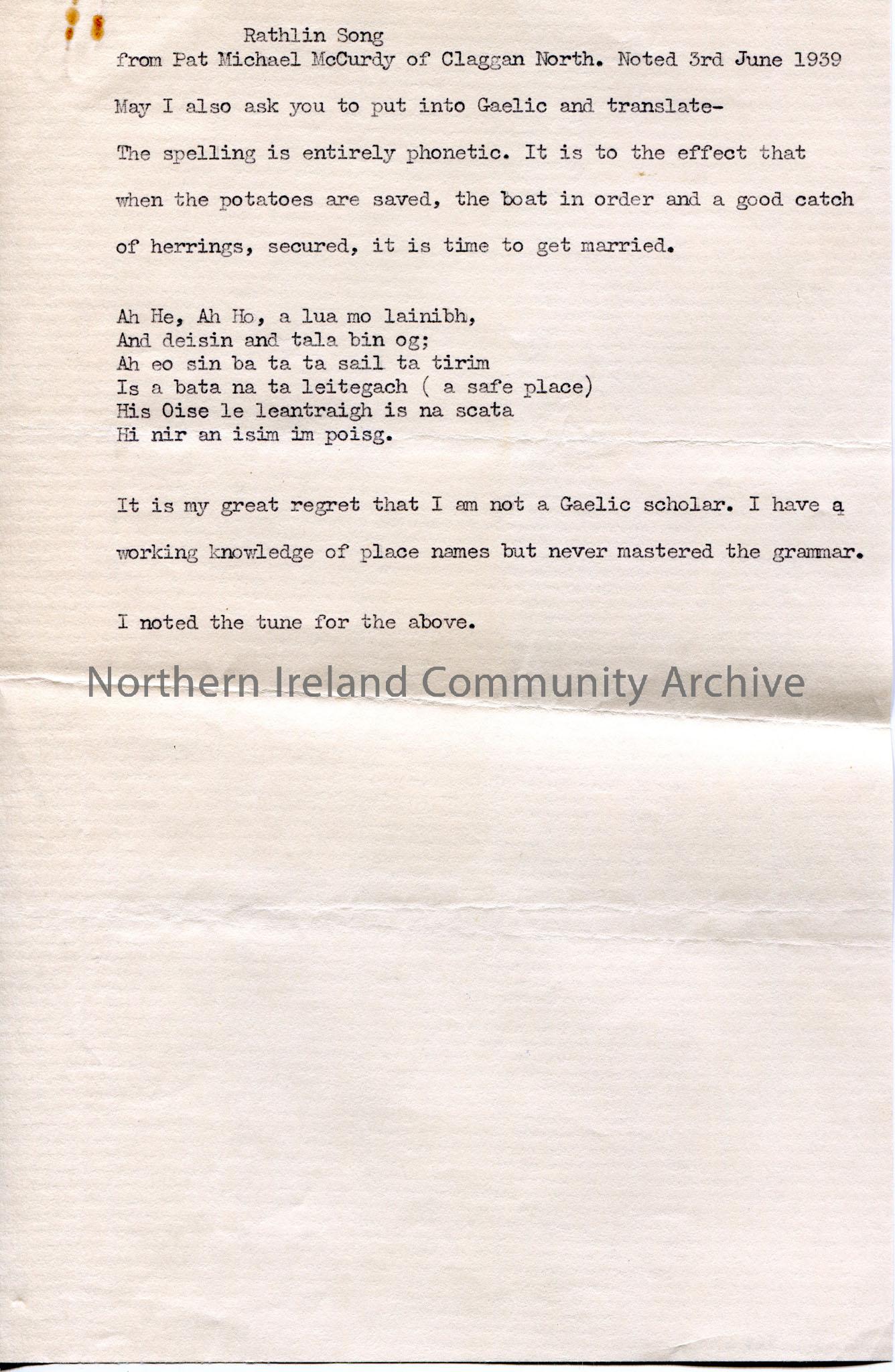 Typed notes re Rathlin Song from Pat Michael McCurdy of Claggan North. Noted 3rd June 1939. Notes ask for song to be translated from Gaelic. Song re marriage.