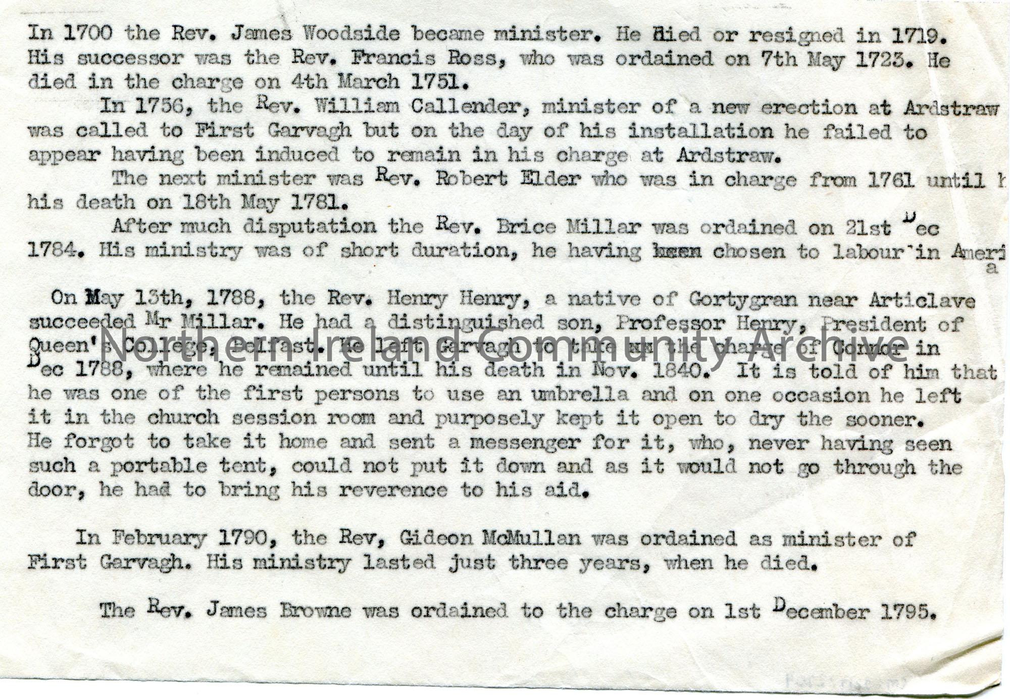 Typed notes re Rev James Woodside, Rev Francis Rose, Rev William Callender, Rev Robert Elder, Rev Brice Millar, Rev Henry Henry, Rev Gideon McMullan and Rev James Browne. Appears to be appointed ministers of First Garvagh [Presbyterian Church].