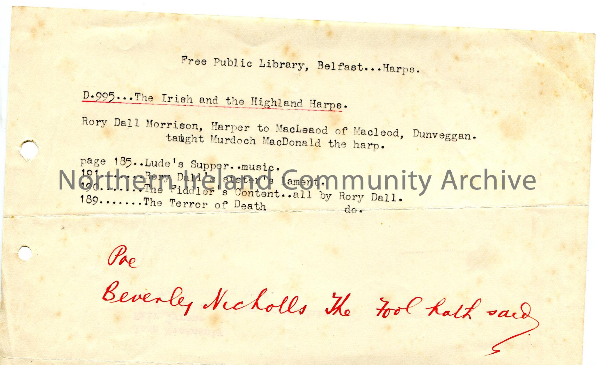 Typed notes re Rory Dall Morrison page numbers of songs in ‘The Irish and The Highland Harps’