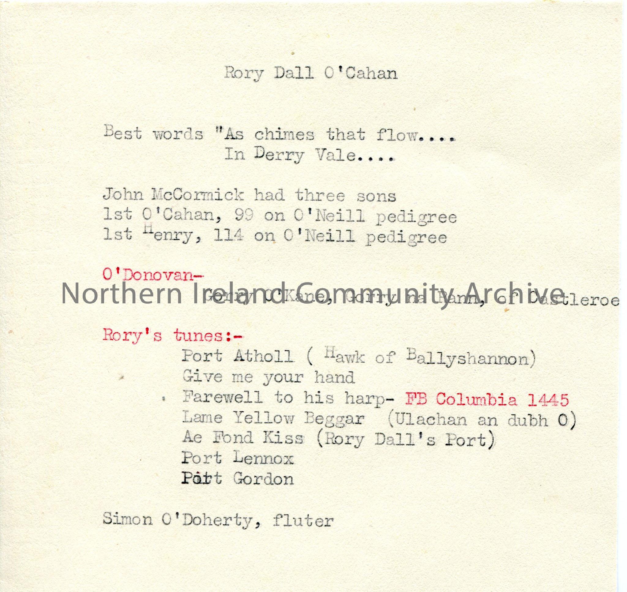 Typed notes re Rory Dall O'Cahan - lineage and 'Rory's tunes'