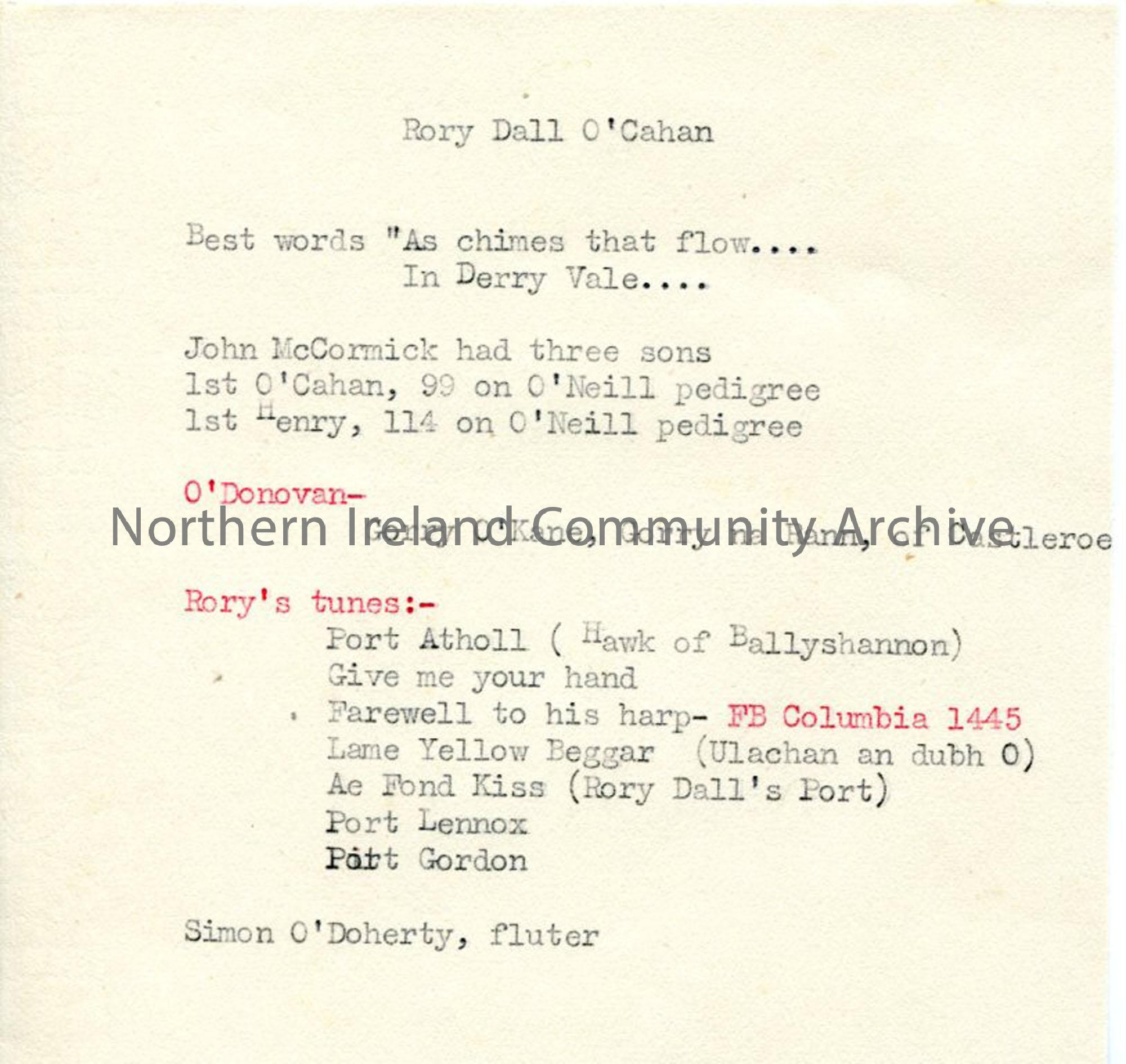 Typed notes re: Rory Dall O'Cahan - lineage and 'Rory's tunes'.