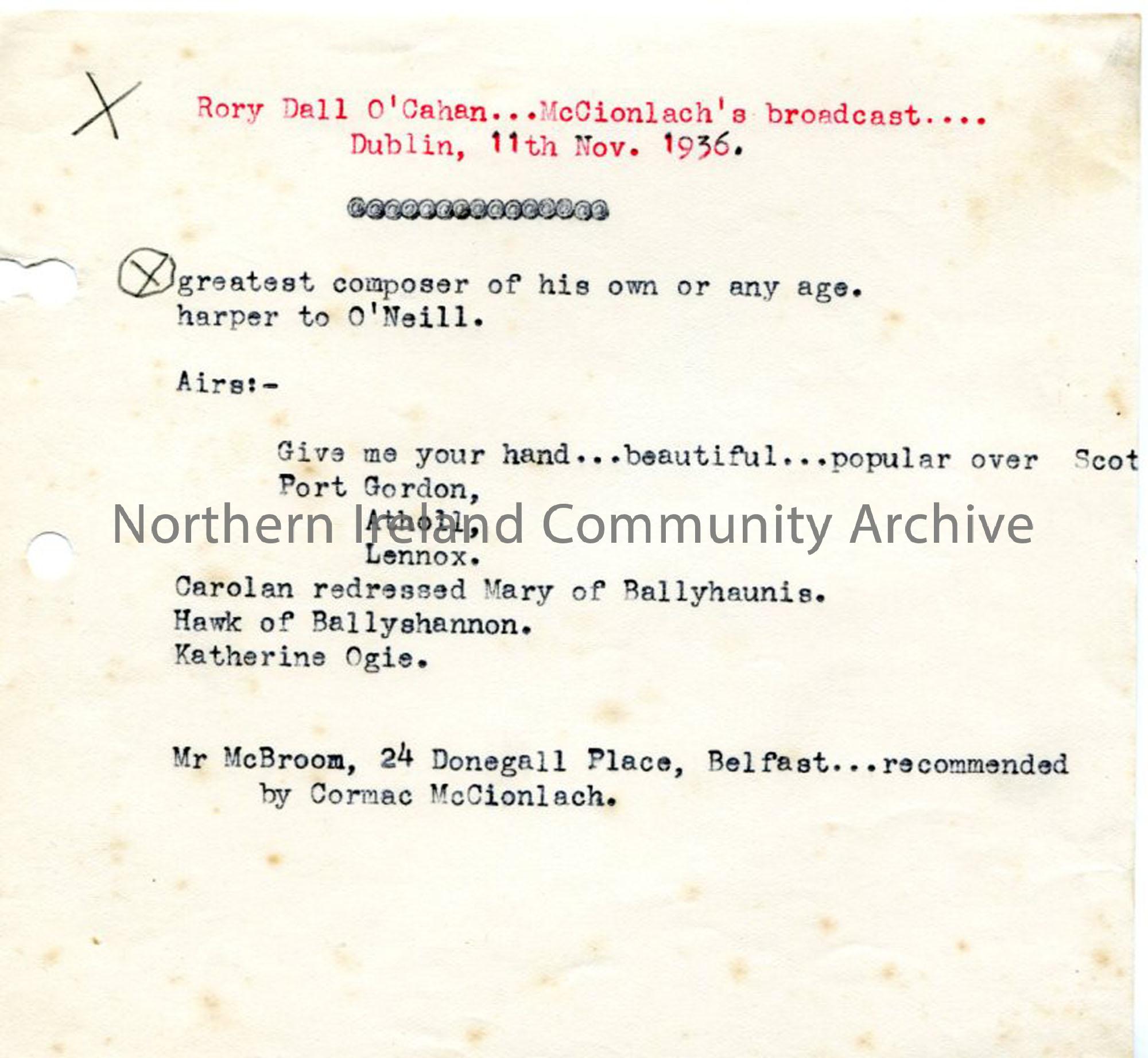 Typed notes re: Rory Dall O'Cahan and a broadcast in Dublin.